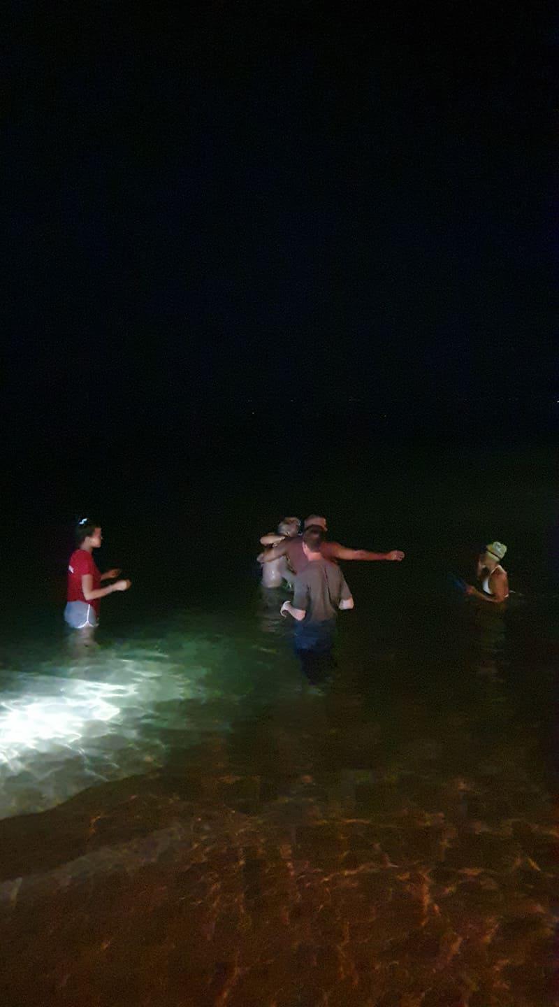- Ούτε και ξέρω τι χιλιόμετρο είναι. Έχει νυχτώσει. Έχει βγει το φεγγάρι. Αρχικά βλέπω μέσα στο νερό τα μπλε πέδιλα της Δέσποινας που φωσφορίζουν. Κολυμπάει ύπτιο ώστε να έχει το νου της που πάω. Στο νερό έχει πέσει και ο Γιώργος. Είναι σα να μου χαράσσουν την τελική ευθεία. Κολυμπάω κι εγώ ύπτιο για να αλλάξω μυϊκή ομάδα και να ξεμπλοκάρουν οι ώμοι και οι αγκώνες. Έχει μείνει η ουρά του γαϊδάρου και δεν τρώγεται με τίποτα. Λες και πάω ακόμη πιο αργά όσο πλησιάζω στον τερματισμό.