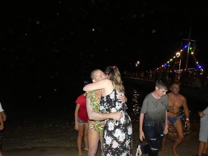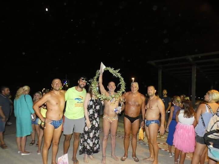 Ακούμε μια φωνή. Γιώργο που είστε; Είναι η Μάγδα η Κωνσταντινίδου που μέσα στο σκοτάδι δε βλέπει καθαρά, αν και η βάρκα μας έχει ανοίξει προβολείς.Είναι η ώρα να μας αφήσει το σκάφος. Είναι η ώρα των λίγων μέτρων για τον τερματισμό. Η Μάγδα, η Δέσποινα, ο Γιώργος κι εγώ είμαστε σαν κουκίδες στο νερό, αλλά μοιάζει η συνύπαρξη μας με αστρικό σχηματισμό, μόνο που αντί για ουρανό έχουμε θάλασσα. Η στιγμή έφθασε. Βλέπω το πλήθος κόσμου στην ακτή και την προβλήτα. Και παίρνω δύναμη για να “σπριντάρω”. Πατάω άμμο. Πανηγυρίζω. Με στεφανώνουν. Πρώτα πέφτω στην αγκαλιά της μεγάλης μου ανιψιάς και πνευματικής μου κόρης Μαρίας Μελίνας και μετά επιστρέφω στη θάλασσα για να αγκαλιάσω το Γιώργο, τη Δέσποινα, τη Μάγδα, αλλά και το παρεάκι μου από τον Ποταμό Επανομής τα ” Καλαμαριώτικα Παλτά” μου Μίλτο Μπαλίδη, Δημήτρη Σακελλάρη, Όμηρο Καζαντζίδη. Δε μπορούσαν να είναι εκεί η Κατερίνα η Ντέλλα, ο Σάκης ο Ηρακλής και ο Ευάγγελος Στέφος. Αλλά εγώ τους έβλεπα. Ήταν μαζί μου νοερά.
