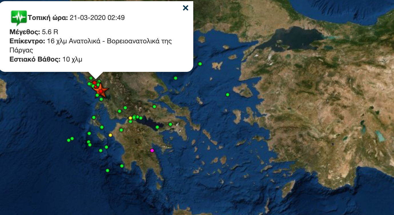 Ισχυρή σεισμική δόνηση μεγέθους 5,6 βαθμών της Κλίμακας Ρίχτερ σημειώθηκε στις 2:49 τα ξημερώματα, 14 χιλιόμετρα ανατολικά-βορειοανατολικά της Πάργας.