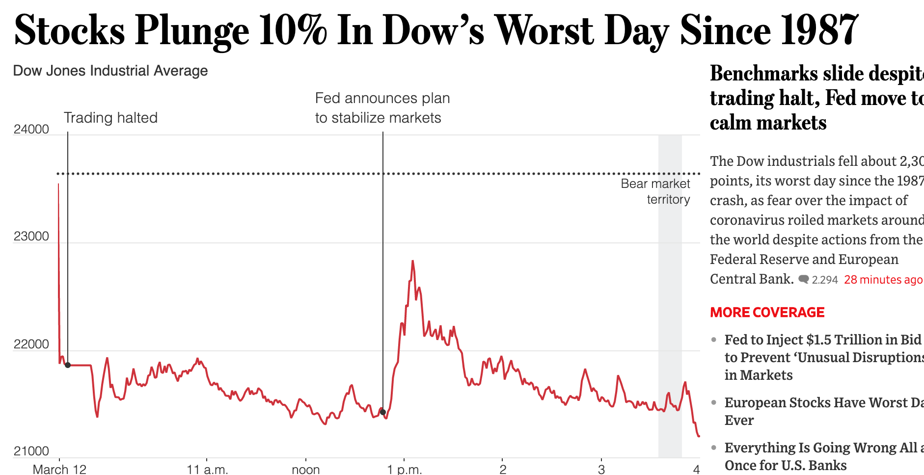 Το Χρηματιστήριο της Νέας Υόρκης κατέρρευσε σήμερα, με τον βιομηχανικό δείκτη Dow Jones να καταγράφει τη μεγαλύτερη πτώση του μετά το κραχ του Οκτωβρίου του 1987, μέσα σε ένα κλίμα γενικευμένου πανικού που προκαλεί η πανδημία του κορονοϊού. Σύμφωνα με τα προσωρινά αποτελέσματα στο κλείσιμο της συνεδρίασης, ο Dow Jones κατέρρευσε κατά 9,99%, κλείνοντας στις 21.200,47 μονάδες, ο Nasdaq υποχώρησε κατά 9,43% στις 7.201,80 μονάδες και ο S&P 500 βυθίστηκε κατά 9,51% στις 2.480,73 μονάδες. ΓΣ