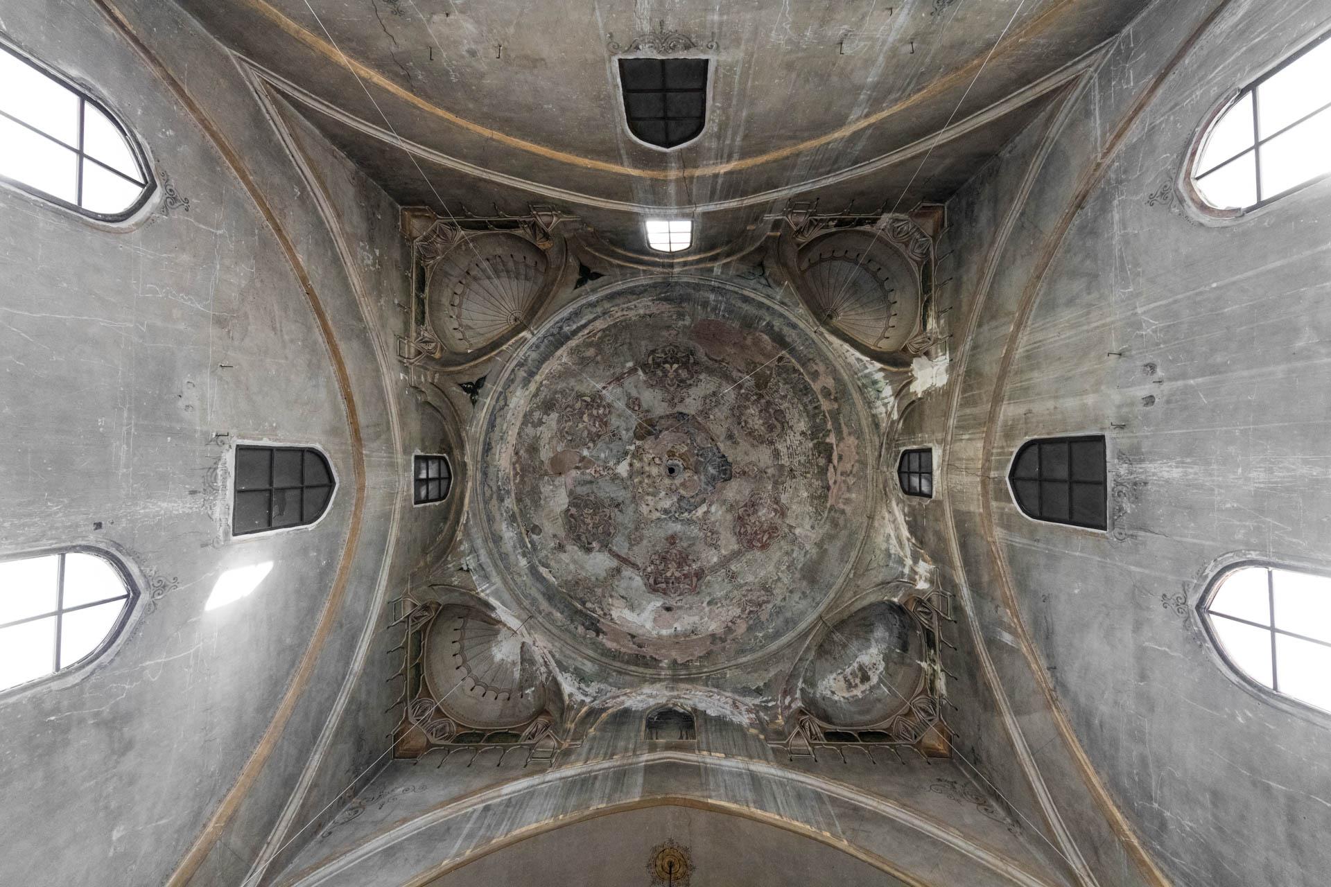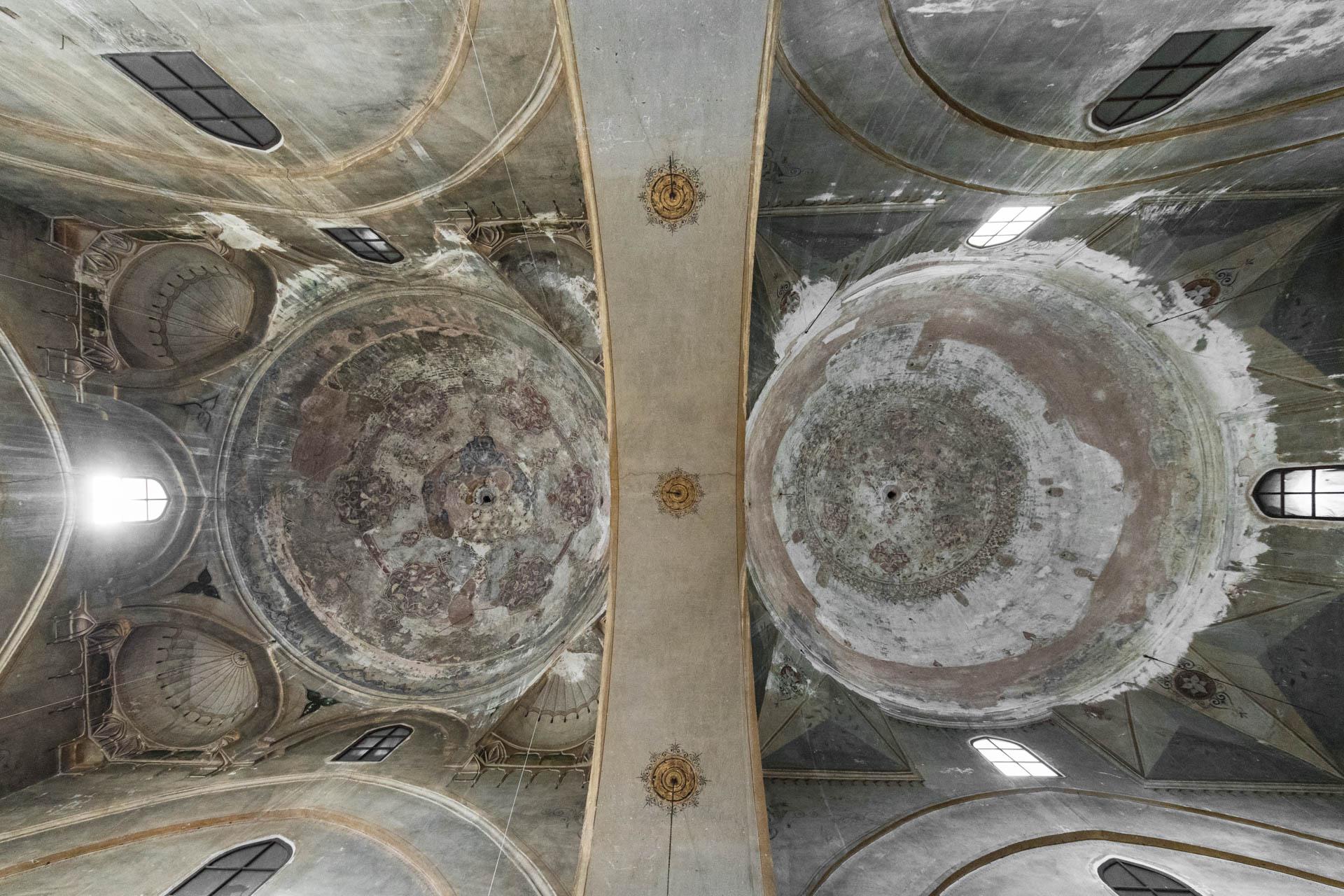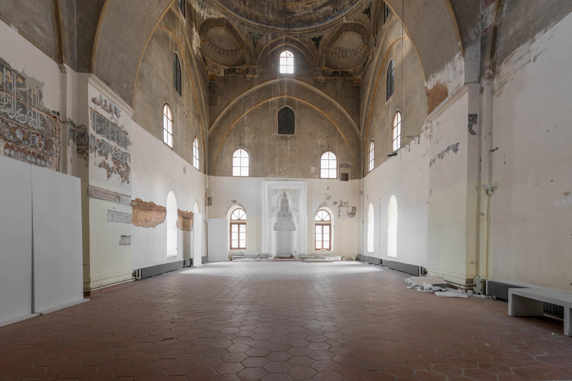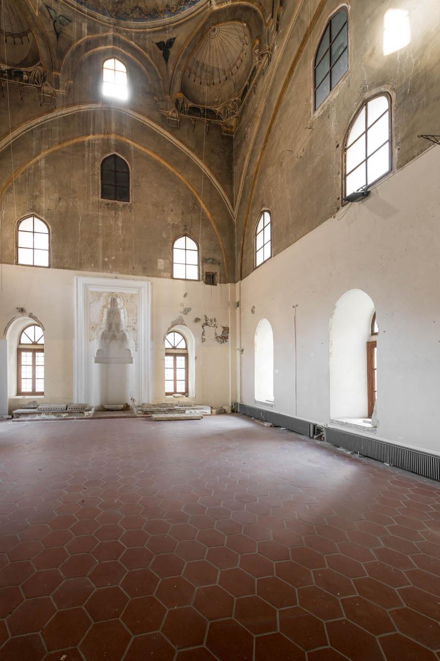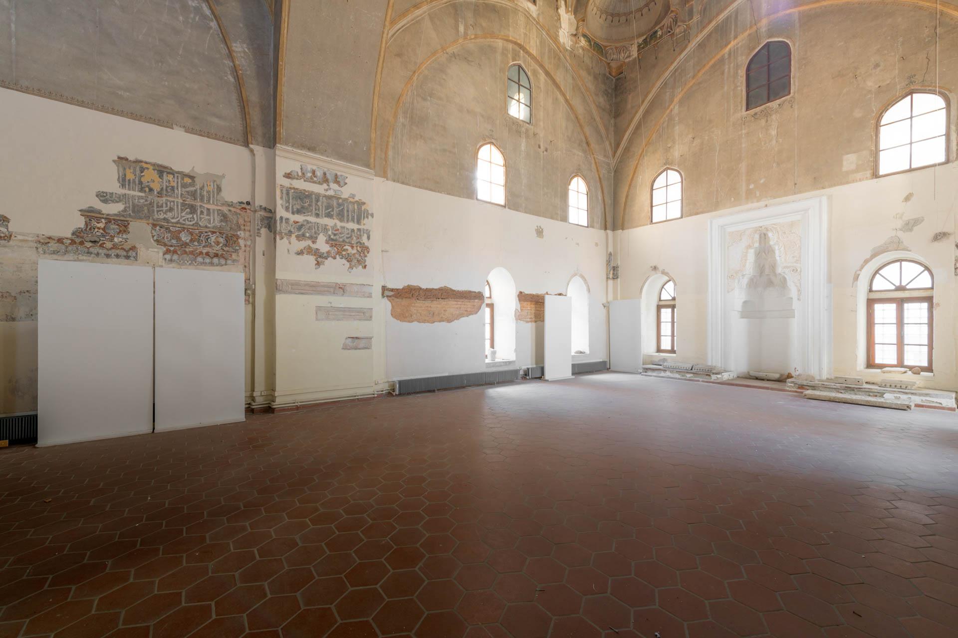 Διασώζεται ένα μέρος της στους θόλους (γεωμετρικά συμπλέγματα), στα “σφαιρικά τρίγωνα” ιδιαίτερα του δεύτερου τρούλου και στους τοίχους, όπου υπάρχουν και ρήσεις από το κοράνι. Στο βάθος του κεντρικού χώρου, απέναντι από την είσοδο και στον τοίχο που βρίσκεται προς την μεριά της Μέκκα, υπάρχει το Μιχράμπ. Στα βόρεια και στα νότια, υπάρχουν από δύο μικρότεροι τετράγωνοι χώροι στεγασμένοι με τρούλους. Στα δυτικά μπροστά στην κύρια είσοδο, υπάρχει ανοιχτή στοά με τόξα που στηρίζονται σε έξι κίονες. Η στοά είναι καλυμμένη με πέντε τρούλους, από τους οποίους ο κεντρικός είναι ο ψηλότερος. Στη βορειοδυτική γωνία του κτιρίου σώζεται η βάση, κατασκευασμένη με ορθογώνιους πωρόλιθους.