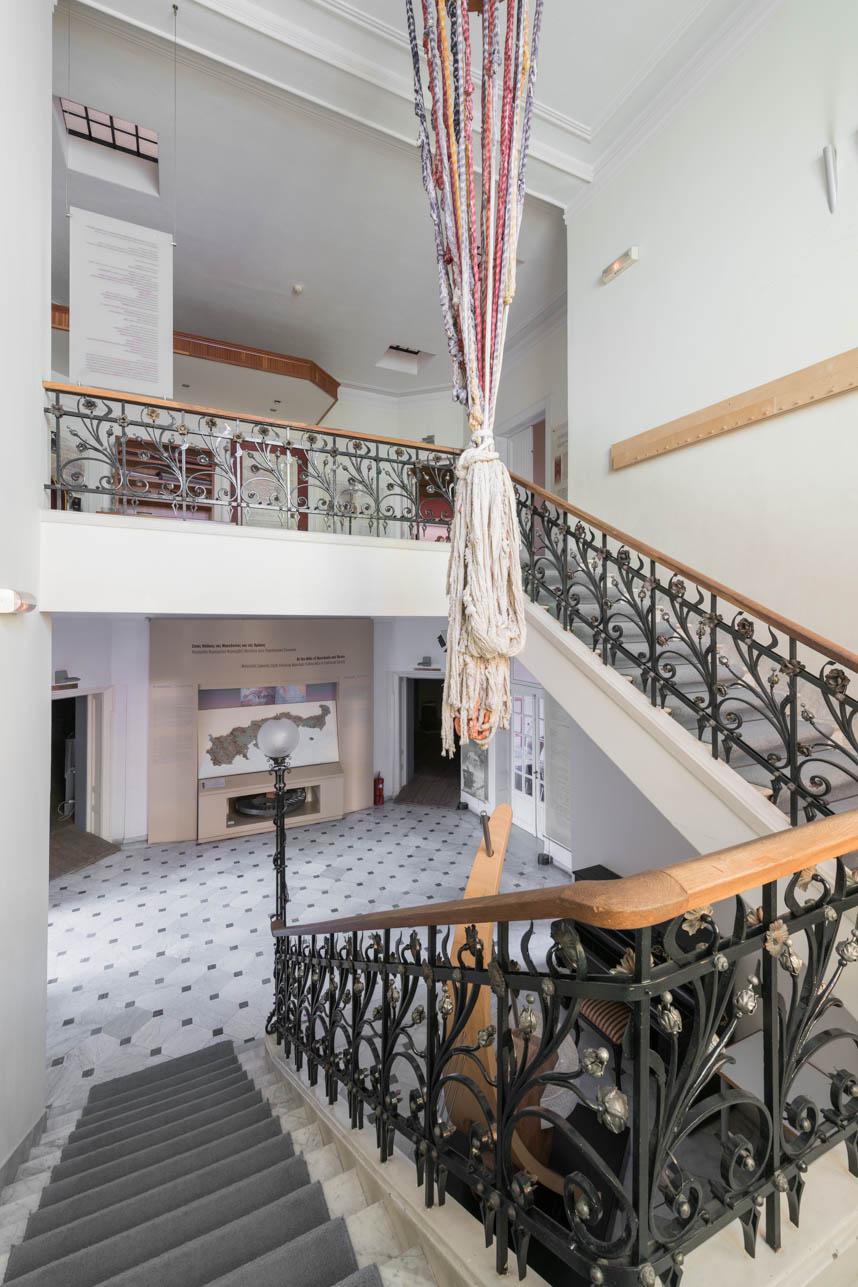 Ένα μεγάλο πολύχρωμο υαλογράφημα με θέμα τον Παράδεισο, μοναδικό σωζόμενο δείγμα βιτρό ιδιωτικής κατοικίας της Θεσσαλονίκης, εξυπηρετεί τις ανάγκες φωτισμού του κεντρικού κλιμακοστασίου της έπαυλης.