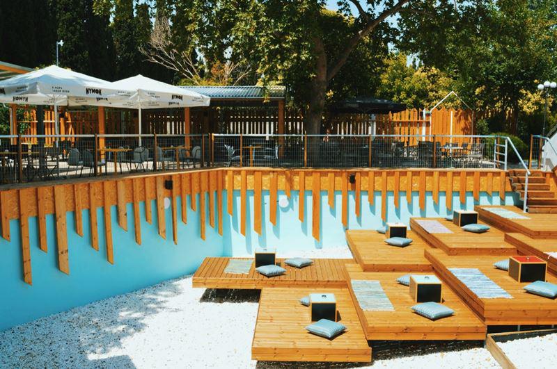 Η πισίνα που υπήρχε άλλοτε έχει “μεταμορφωθεί” σε έναν ξύλινο χώρο με ντεκ, μαξιλάρες και πολύχρωμες χίπι κουρελούδες όπου η χαλάρωση είναι δώρο. Καθώς τα ηχεία παίζουν ωραίες σόουλ, φανκ και έθνικ μουσικές που σε ταξιδεύουν, ξαφνικά αισθάνεσαι ότι έφυγες διακοπές και ας είσαι μέσα στον αστικό ιστό.