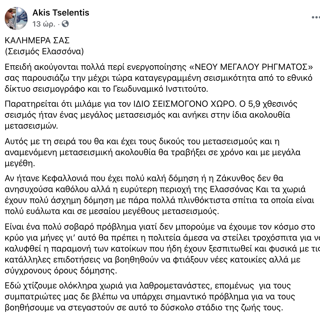 Η φράση του συμπεριλαμβάνεται σε μια ανάρτηση του για τους σεισμούς της Ελασσόνας και τους κατοίκους της περιοχής που έμειναν χωρίς σπίτια εξαιτίας των ζημιών.