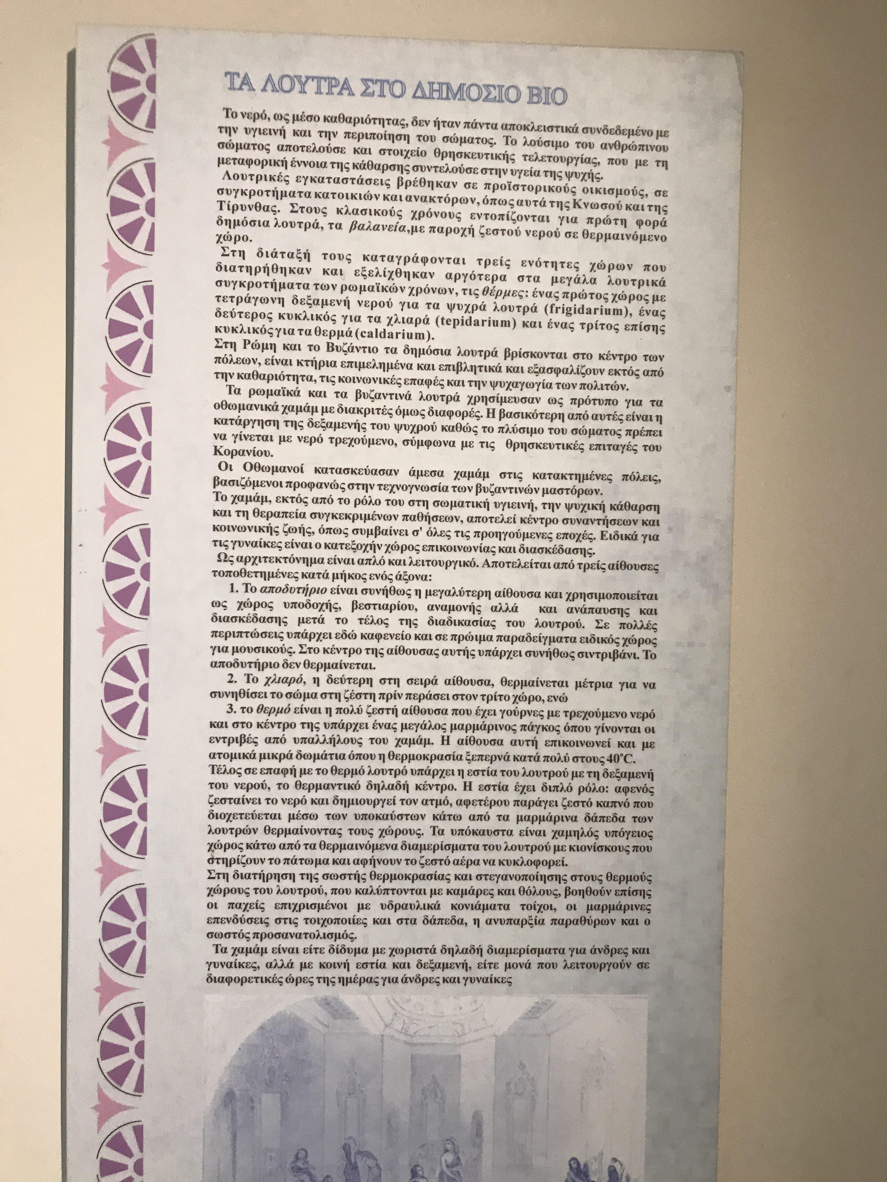 Στο χώρο διασώζονται οι θόλοι, οι μαρμάρινες γούρνες, τα αποδυτήρια, ο χώρος ανάπαυσης και παρουσιάζεται μέσα από φωτογραφίες και κείμενα η ζωή στα λουτρά, οι συνήθειες η κοινωνικοποίηση και οι ιστορίες των ανθρώπων που τα επισκέπτονταν.