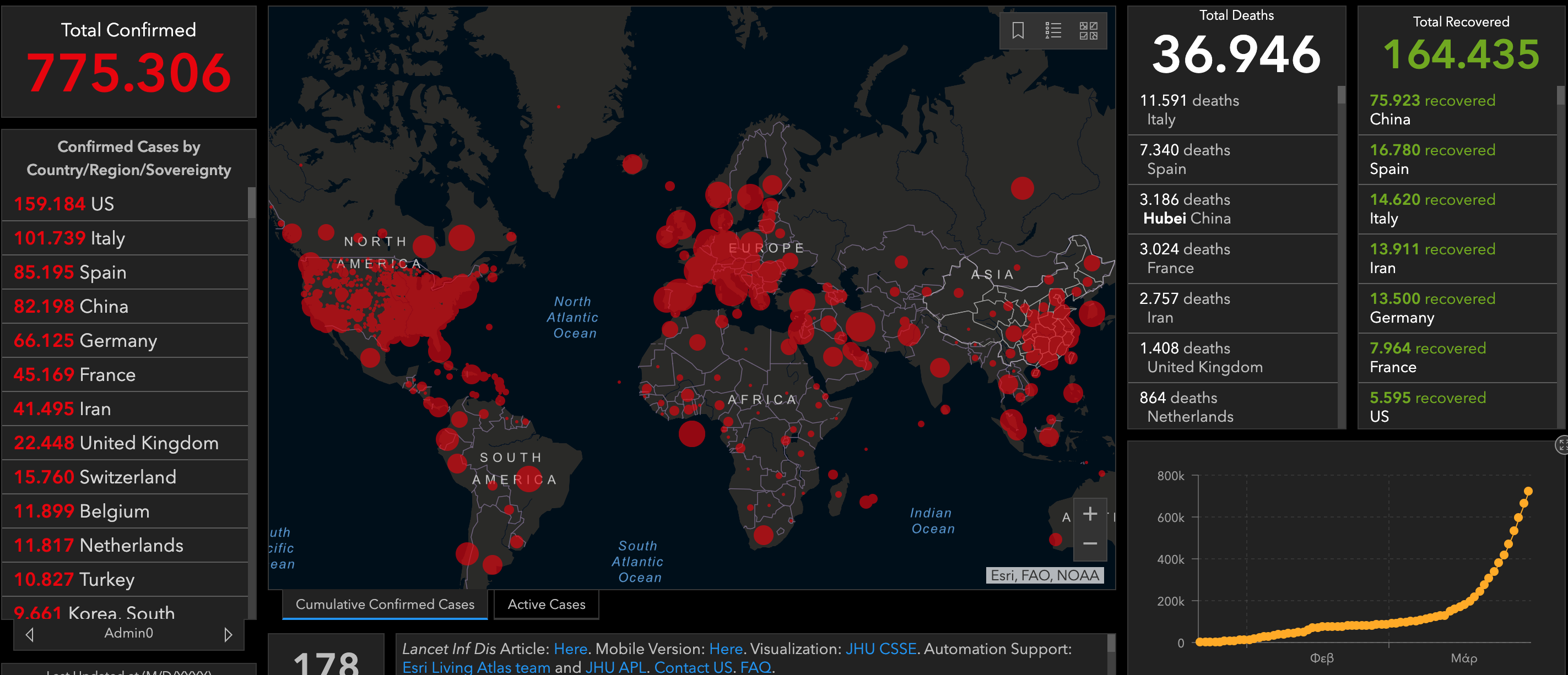 Μέχρι τις 22.οο (ώρα Ελλάδας) τα επιβεβαιωμένα κρούσματα ανέρχονταν στις 757.940 σε 184 χώρες και εδάφη. Από αυτούς τους ασθενείς, οι 148.700 θεωρούνται πλέον αποθεραπευμένοι. Από χθες την ίδια ώρα μέχρι σήμερα αναφέρθηκαν 3.430 νέοι θάνατοι και 60.195 νέα κρούσματα.