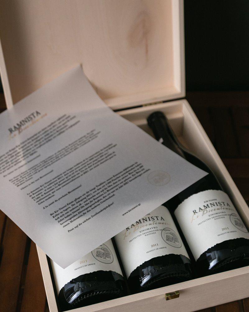 Η αντοχή στον χρόνο της ποικιλίας Ξινόμαυρο είναι αξιωματική και πάνω σε αυτήν την αναμφισβήτητη παραδοχή το Κτήμα Κυρ-Γιάννη διατηρεί μια άτυπη παράδοση παλαίωσης των σοδειών της Ράμνιστας. Με αφορμή, λοιπόν, την υπέροχη σοδειά του 2011, που κλιματολογικά ευνόησε την ποιοτική ωρίμανση των σταφυλιών χωρίς ασθένειες -κι εμφανίζεται μια φορά τη δεκαετία-, και την 200η επέτειο της Επανάστασης του 1821, κυκλοφόρησαν 3.000 φιάλες, με τη σκέψη ότι ένα τέτοιο κρασί αντέχει μέχρι και 200 χρόνια! Το 100% Ξινόμαυρο με δυναμική παλαίωσης στον υπερθετικό βαθμό διαθέτει, σκούρο ρουμπινί χρώμα. Στη μύτη συναντάμε κομψά και ντελικάτα αρώματα μαύρων φρούτων και αποξηραμένης ντομάτας, που συμπληρώνονται από μαύρη σοκολάτα, πάστα ελιάς και νότες μαύρου πιπεριού. Στο στόμα είναι γεμάτο με εξαίσιο όγκο και πλούτο, ευχάριστη οξύτητα, καλοδομημένες τανίνες και μακρά απολαυστική επίγευση. Πρόκειται για μια συλλεκτική έκδοση της Ράμνιστας, που θα κυκλοφορήσει σε premium ξύλινη κασετίνα τριών φιαλών και αποτελεί το ιδανικό δώρο για το οινόφιλο κοινό, που μπορεί να την ανακαλύψει σ’ επιλεγμένες κάβες.