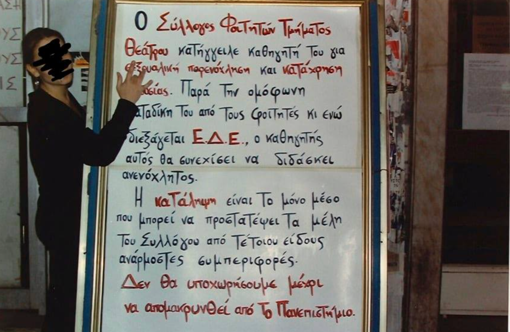 ”1997. Μπροστά από το Τμήμα Θεάτρου του Α.Π.Θ., ένα πλακάτ (αναγνωρίζω τα γράμματά μου) ενημερώνει τους περαστικούς για τους λόγους της κατάληψης στο κτήριο, που διήρκησε σχεδόν δύο μήνες. Ήταν μία από τις εξαιρέσεις, όπου τα θύματα ενός καθηγητή που παρενοχλούσε φοιτήτριές του μεθοδικά, δόλια και αναίσχυντα μίλησαν μεταξύ τους, μίλησαν με τους άλλους συμφοιτητές και συμφοιτήτριές τους και όλοι μαζί στάθηκαν απέναντι στη χυδαιότητα. Ήμασταν ένα μικρό τμήμα, με μια συντριπτική πλειοψηφία κοριτσιών (έλειπε, δηλαδή, αυτό που λέμε σήμερα τοξική αρρενωπότητα).