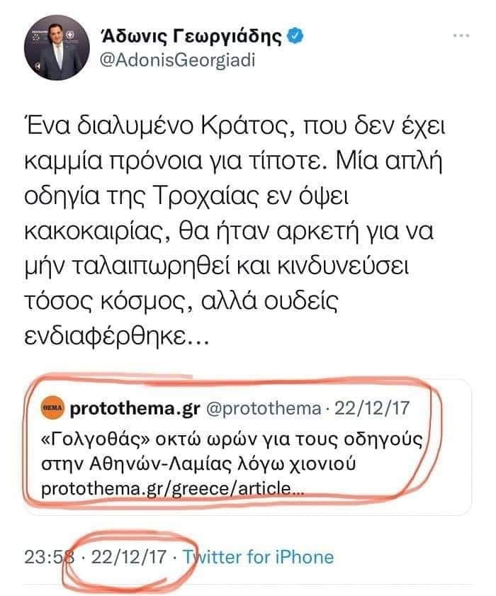 Την ώρα που γιατροί πήγαν με τα πόδια στις εφημερίες τους, ντελιβεράδες έκαναν τους τροχονόμους, φορτηγατζήδες κουβαλούσαν μοίραζαν με πρωτοβουλία τους τρόφιμα στους εγκλωβισμένους, ο πρωθυπουργός παρέμενε εξαφανισμένος δυο μερόνυχτα για να δηλώσει ””Καλημέρα σας. Θέλω να ξεκινήσω ζητώντας μία προσωπική και ειλικρινή συγγνώμη από τους συμπολίτες μας οι οποίοι ταλαιπωρήθηκαν επί πολλές ώρες, μένοντας εγκλωβισμένοι στην Αττική Οδό…. Έχουμε βάλει τον πήχη των προσδοκιών ψηλά και η σύγκριση δεν μπορεί να γίνεται με τις αδυναμίες του χθες, γίνεται με τις ανάγκες του σήμερα” .