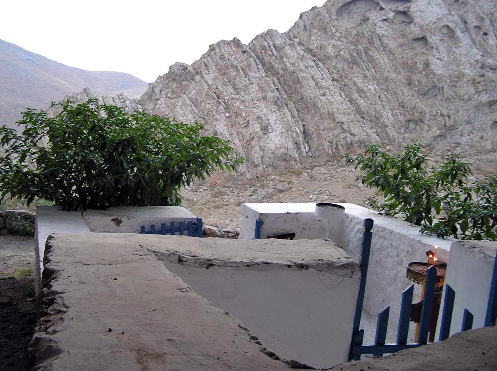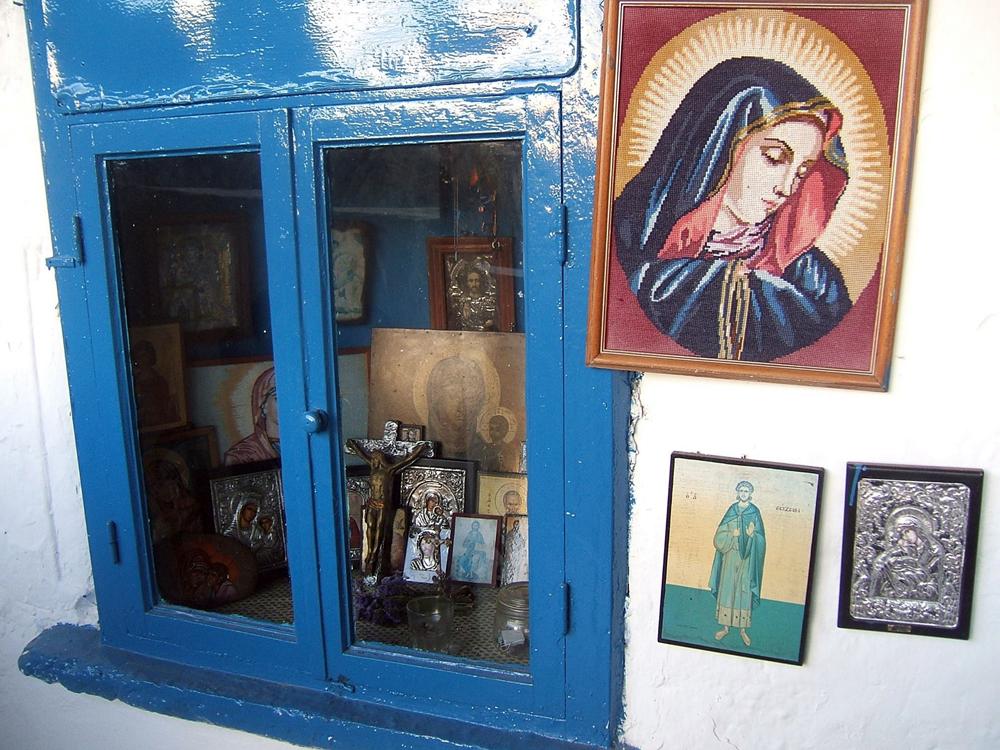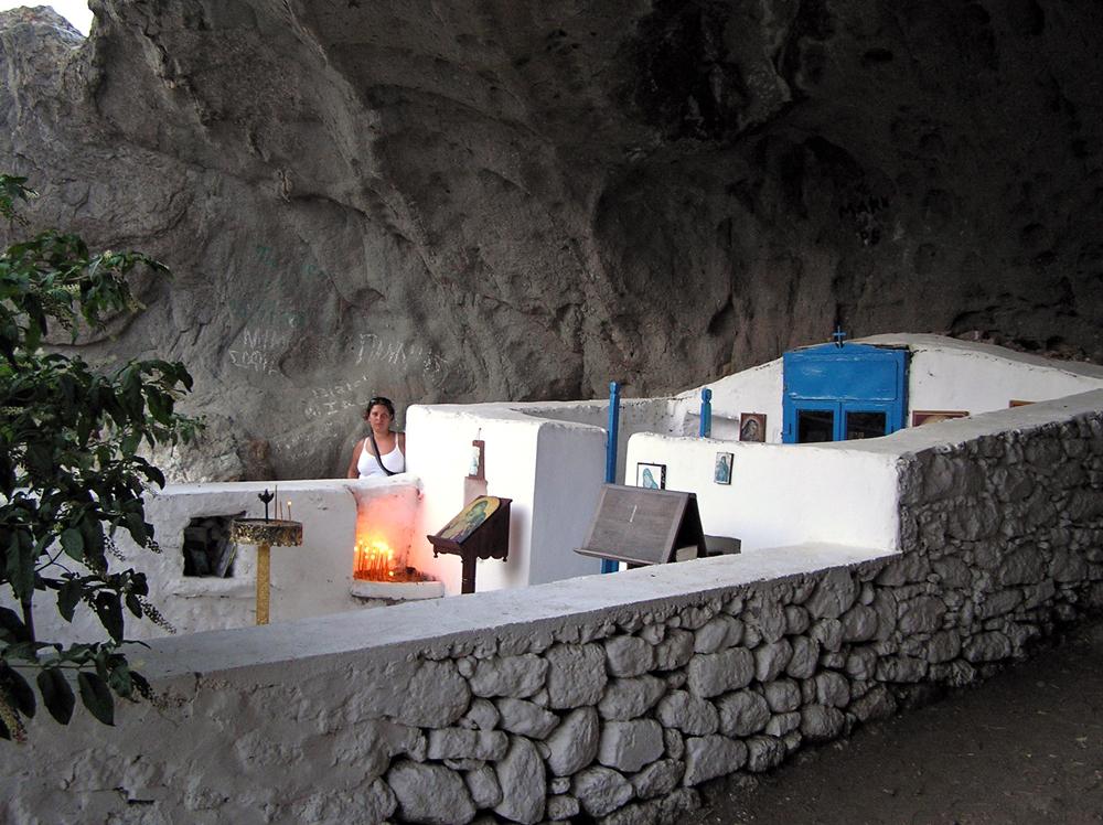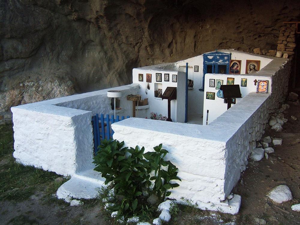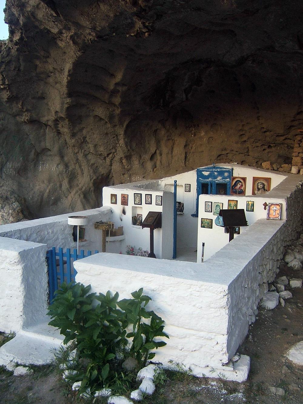 Όταν φτάνει κανείς στον ναό, περνάει μέσα από την ξύλινη μπλε πόρτα. Αριστερά και δεξιά μπορεί να δει εικόνες και τάματα των πιστών, αναμμένα καντηλάκια και κεριά που μαρτυρούν πως υπήρχαν πρωτύτερα επισκέπτες.