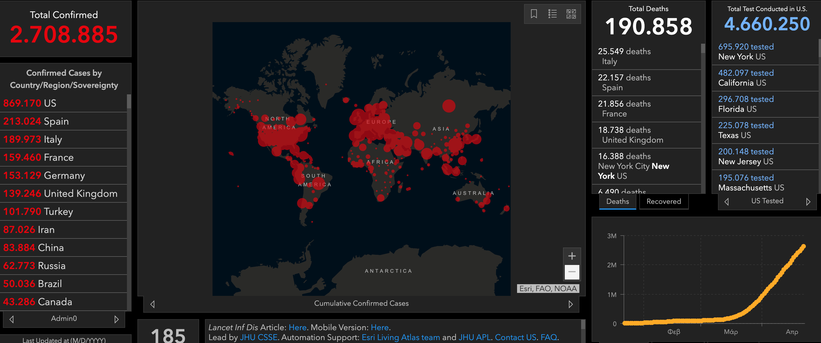 Μέχρι χθες βράδυ είχαν καταγραφεί περισσότερα από 2.675.050 επιβεβαιωμένα κρούσματα σε 193 χώρες και εδάφη. Τουλάχιστον 708.400 από αυτούς τους ασθενείς έχουν πλέον αναρρώσει.