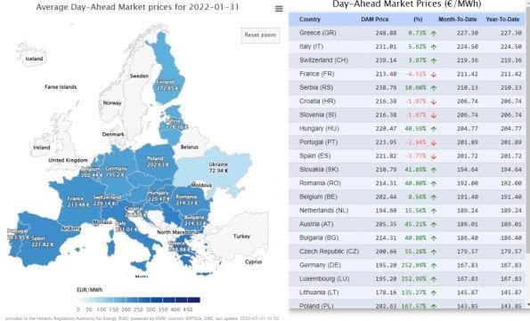 Βαθιά ενεργειακή κρίση βιώνει η Ελλάδα, η οποία τον Ιανουάριο είχε το πιο ακριβό ρεύμα της Ευρώπης με 227,3 ευρώ ανά μεγαβατώρα. Στην μέση τιμή Ιανουαρίου, στη λίστα ακολουθούν η Ιταλία με 224,5 €/MWh, η Ελβετία με 219,36 €/MWh και η Γαλλία με 211,42 €/MWh. μεγαβατώρα.