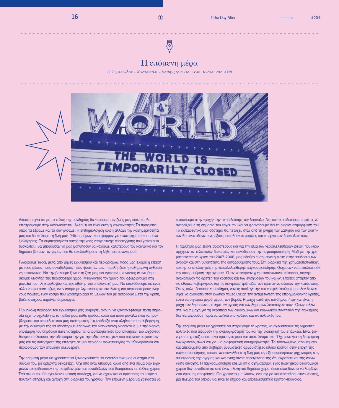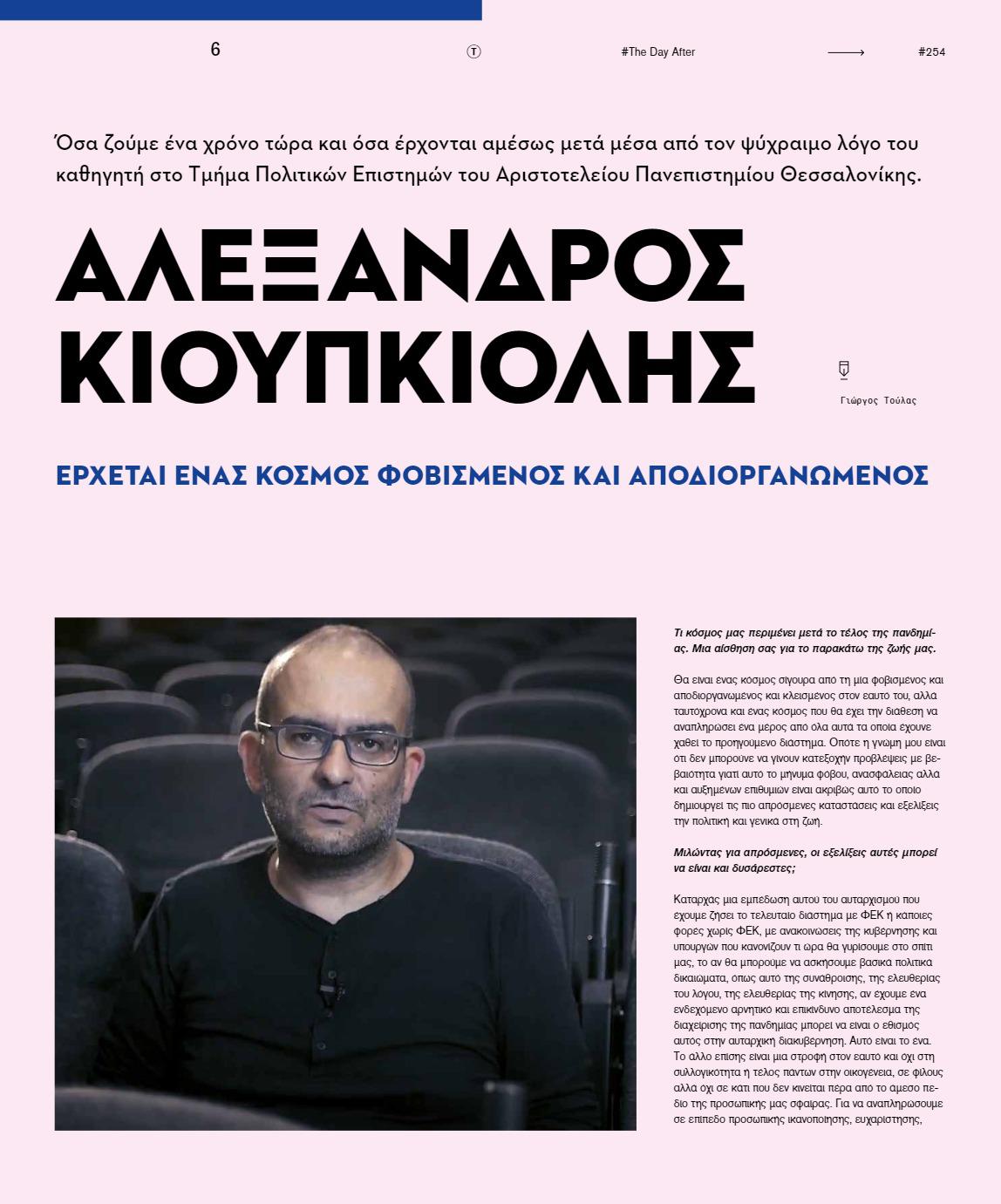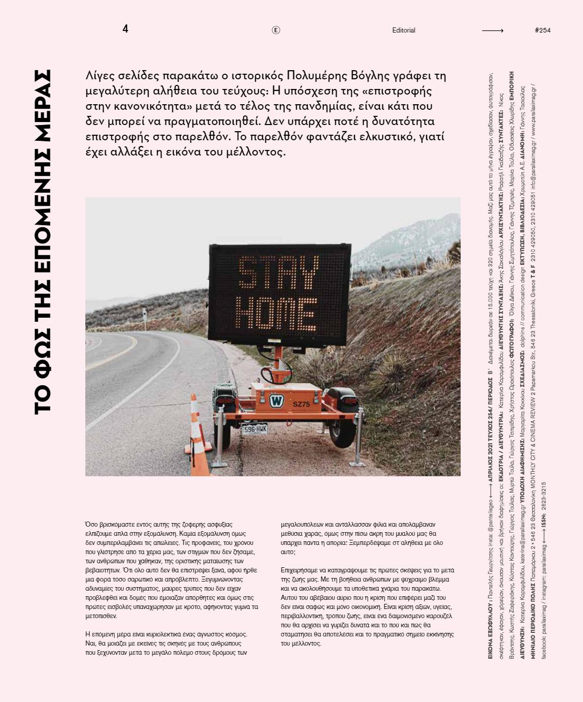 Ο ιστορικός Πολυμέρης Βόγλης γράφει τη μεγαλύτερη αλήθεια του τεύχους: Η υπόσχεση της «επιστροφής στην κανονικότητα» μετά το τέλος της πανδημίας, είναι κάτι που δεν μπορεί να πραγματοποιηθεί. Δεν υπάρχει ποτέ η δυνατότητα επιστροφής στο παρελθόν. Το παρελθόν φαντάζει ελκυστικό, γιατί έχει αλλάξει η εικόνα του μέλλοντος.