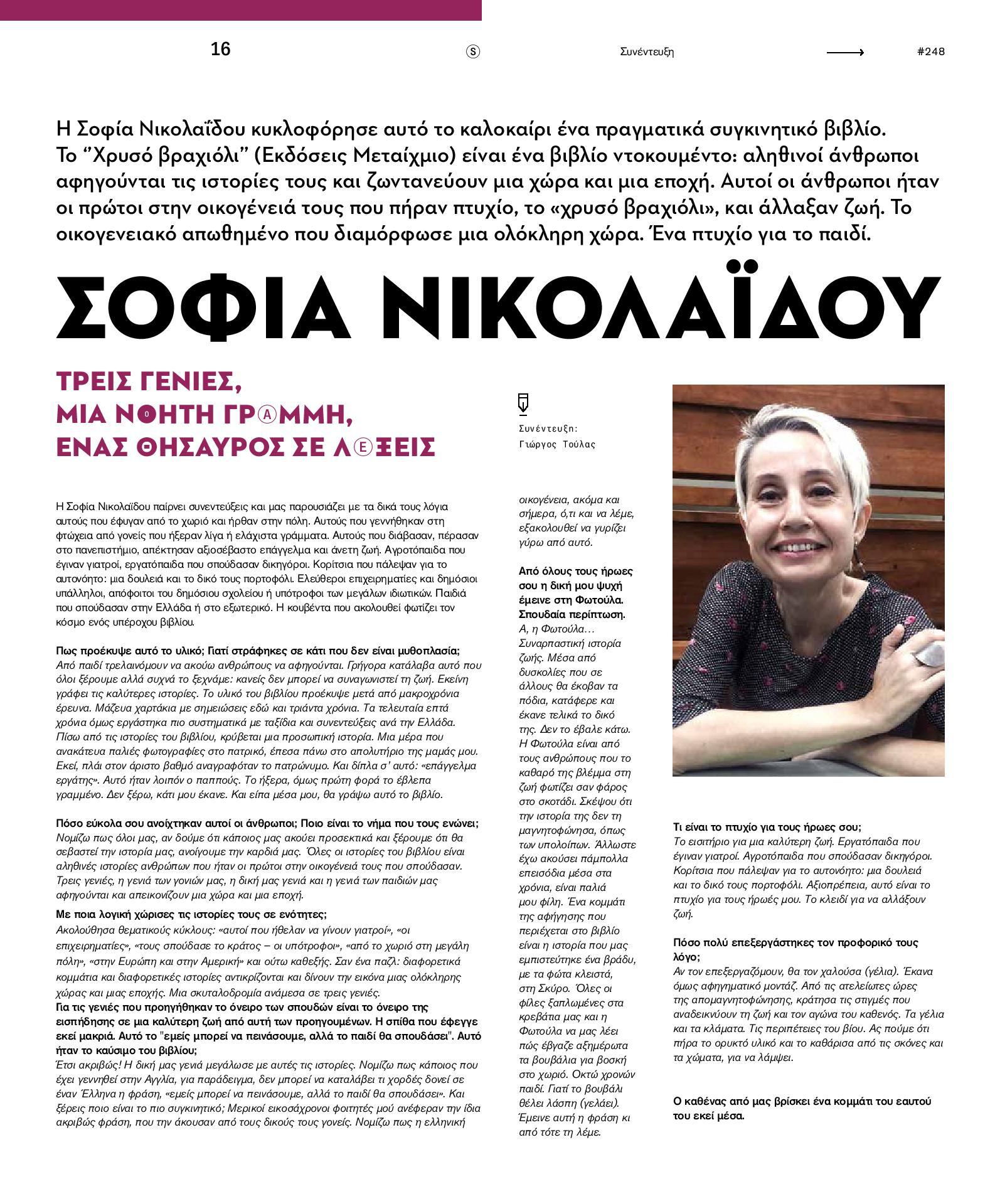 Η Σοφία Νικολαΐδου κυκλοφόρησε αυτό το καλοκαίρι ένα πραγματικά συγκινητικό βιβλίο. Το «Χρυσό βραχιόλι» είναι ένα βιβλίο ντοκουμέντο: αληθινοί άνθρωποι αφηγούνται τις ιστορίες τους και ζωντανεύουν μια χώρα και μια εποχή. Αυτοί οι άνθρωποι ήταν οι πρώτοι στην οικογένειά τους που πήραν πτυχίο, το «χρυσό βραχιόλι», και άλλαξαν ζωή. Το οικογενειακό απωθημένο που διαμόρφωσε μια ολόκληρη χώρα. Ένα πτυχίο για το παιδί. Μια ενδιαφέρουσα συνέντευξη στον Γιώργο Τούλα.