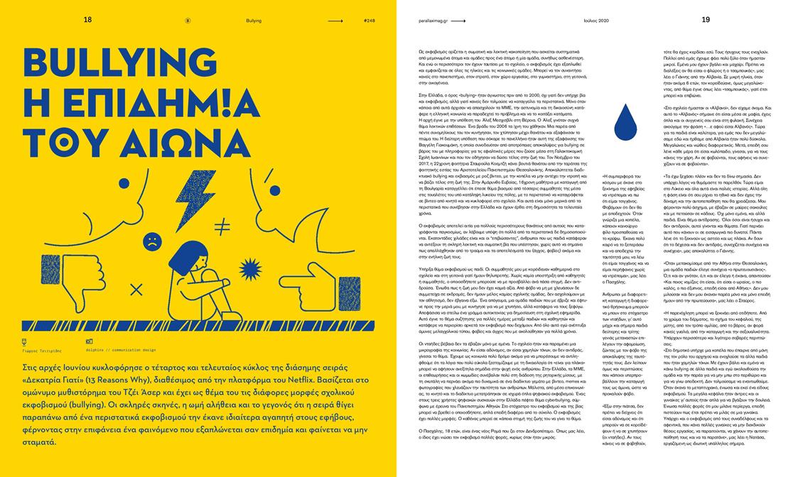 Ως εκφοβισμός ορίζεται η σωματική και λεκτική κακοποίηση που ασκείται συστηματικά από μεμονωμένα άτομα και ομάδες προς ένα άτομο ή μία ομάδα, συνήθως ασθενέστερη. Και ενώ οι περισσότεροι τον έχουν ταυτίσει με το σχολείο, ο εκφοβισμός έχει εξαπλωθεί και εμφανίζεται σε όλες τις ηλικίες και τις κοινωνικές ομάδες. Μπορεί να τον συναντήσει κανείς στο πανεπιστήμιο, στον στρατό, στον χώρο εργασίας, στο γυμναστήριο, στη γειτονιά, στην οικογένεια. Ο Γιώργος Τσιτιρίδης γράφει για την επιδημία του αιώνα που είναι το bullying.