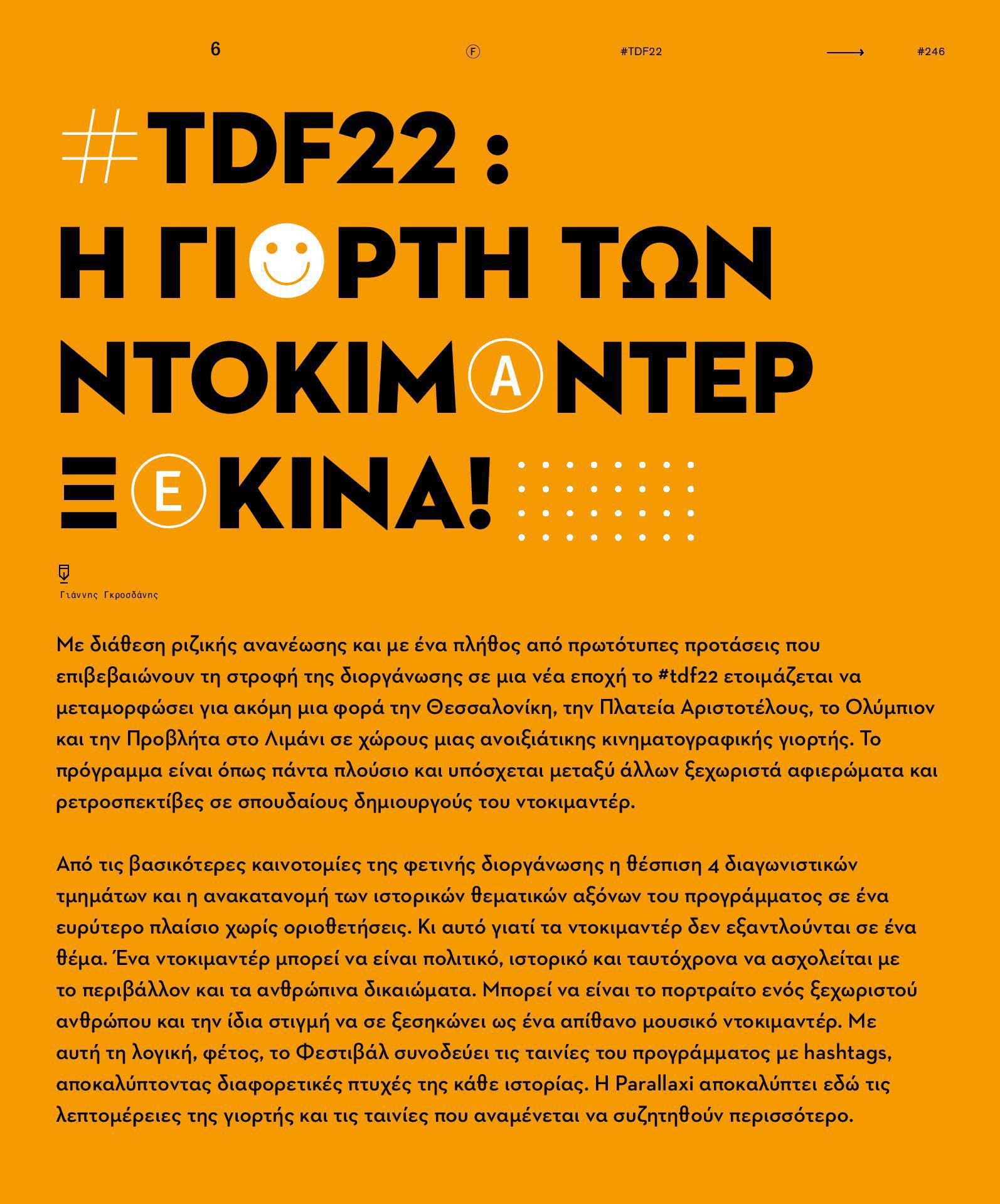 Με διάθεση ριζικής ανανέωσης και με ένα πλήθος από πρωτότυπες προτάσεις που επιβεβαιώνουν τη στροφή της διοργάνωσης σε μια νέα εποχή, το 22o Φεστιβάλ Ντοκιμαντέρ Θεσσαλονίκης (#TDF22) ετοιμάζεται να μεταμορφώσει για ακόμη μια φορά την Θεσσαλονίκη, την Πλατεία Αριστοτέλους, το Ολύμπιον και την Προβλήτα στο Λιμάνι σε χώρους μιας ανοιξιάτικης κινηματογραφικής γιορτής. Το πρόγραμμα είναι όπως πάντα πλούσιο και υπόσχεται μεταξύ άλλων ξεχωριστά αφιερώματα και ρετροσπεκτίβες σε σπουδαίους δημιουργούς του ντοκιμαντέρ. Η Parallaxi αποκαλύπτει τις λεπτομέρειες της γιορτής και τις ταινίες που αναμένεται να συζητηθούν περισσότερο.
