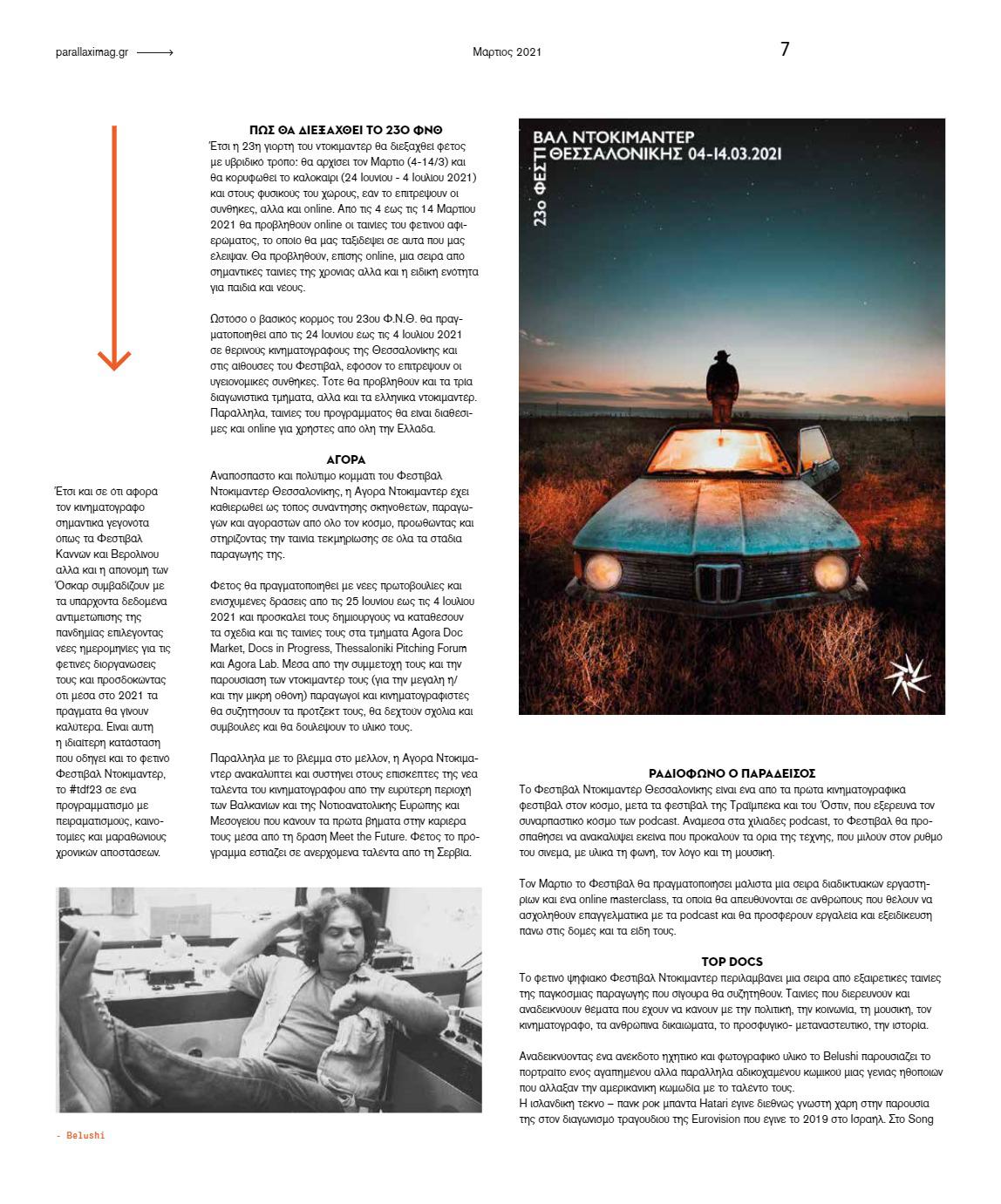 Η Parallaxi Μαρτίου είναι εδώ, με ένα τεύχος που σε κρατάει μέχρι την τελευταία σελίδα. Ταξιδεύοντας νοητά με το 23ο Φεστιβάλ Ντοκιμαντέρ Θεσσαλονίκης. Ένα αφιέρωμα για τη γιορτή του ντοκιμαντέρ που φέτος θα διεξαχθεί με υβριδικό τρόπο. Πρόσωπα που αγαπάμε και πιστεύουμε στη Θεσσαλονίκη σήμερα. Οι συντάκτες της Parallaxi μας παρουσιάζουν εκείνους για τους οποίους θα συζητάμε στο μέλλον. Οι «Αόρατοι» Πλανήτες. Η ζωή αυτών που μένουν στο δρόμο. 200 χρόνια από το 1821. Βλογώντας και Ξορκίζοντας μια Επανά(σταση). Ιπποκράτειο. Το μπλε κτίριο και η μάχη που έμεινε στην ιστορία. Συγκλονιστικές περιγραφές αυτών που έζησαν το πρώτο κύμα κορονοϊού στην πρώτη γραμμή. Με υπευθυνότητα τον καιρό της πανδημίας, το κοινωνικό πρόσωπο των εταιρειών.