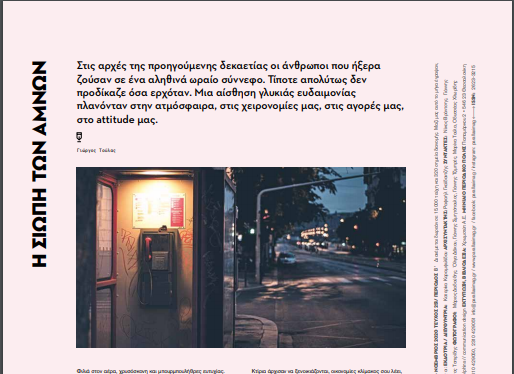 Στις αρχές της προηγούμενης δεκαετίας οι άνθρωποι που ήξερα ζούσαν σε ένα αληθινά ωραίο σύννεφο. Τίποτε απολύτως δεν προδίκαζε όσα ερχόταν. Μια αίσθηση γλυκιάς ευδαιμονίας πλανόνταν στην ατμόσφαιρα, στις χειρονομίες μας, στις αγορές μας, στο attitude μας.