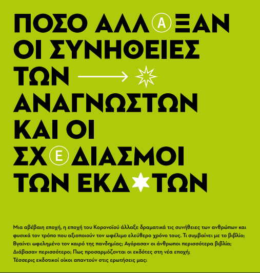 Μια αβέβαιη εποχή, η εποχή του Κορονοϊού άλλαξε δραματικά τις συνήθειες των ανθρώπων και φυσικά τον τρόπο που αξιοποιούν τον ωφέλιμο ελεύθερο χρόνο τους. Τι συμβαίνει με το βιβλίο; Βγαίνει ωφελημένο τον καιρό της πανδημίας; Αγόρασαν οι άνθρωποι περισσότερα βιβλία; Διάβασαν περισσότερο; Πως προσαρμόζονται οι εκδότες στη νέα εποχή; Τέσσερις εκδοτικοί οίκοι απαντούν στις ερωτήσεις μας: