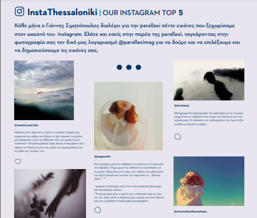Κάθε μήνα ο Γιάννης Σιμητόπουλος διαλέγει για την parallaxi πέντε εικόνες που ξεχωρίσαμε στον ωκεανό του instagram. Ελάτε και εσείς στην παρέα της parallaxi, ταγκάρoντας στην φωτογραφία σας τον δικό μας λογαριασμό @parallaximag για να δούμε και να επιλέξουμε και να δημοσιεύσουμε τις εικόνες σας.