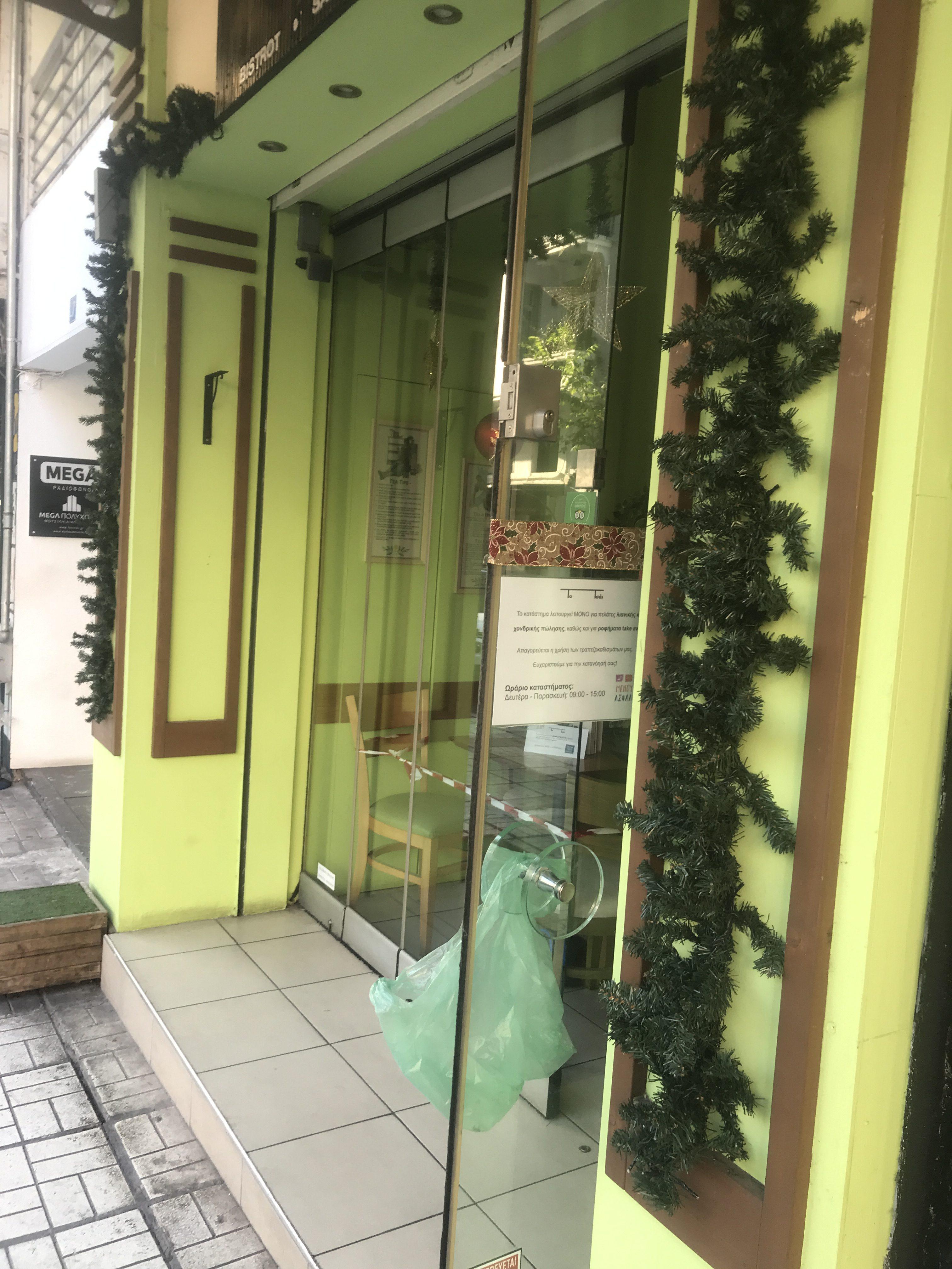 Βιτρίνες και προσόψεις καταστημάτων εύχονται καλά Χριστούγεννα και ευτυχισμένο το 2021.