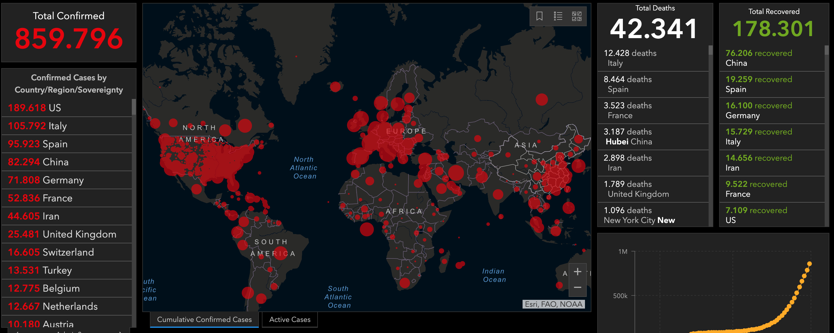 859796 κρούσματα, 42341 θάνατοι, 178301 αποθεραπευμένοι.