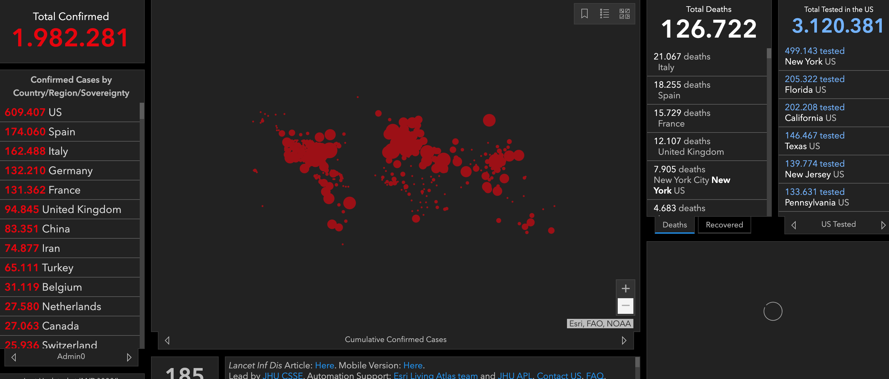 Από τα τέλη Μαρτίου, οι ΗΠΑ είναι επίσης η χώρα του κόσμου με τον μεγαλύτερο αριθμό επιβεβαιωμένων κρουσμάτων. Τη Δευτέρα ξεπεράστηκε το όριο των 600.000 διαγνωσμένων μολύνσεων από τον SARS-CoV-2. Έχουν γίνει περίπου 3 εκατομμύρια διαγνωστικές εξετάσεις στη χώρα.
