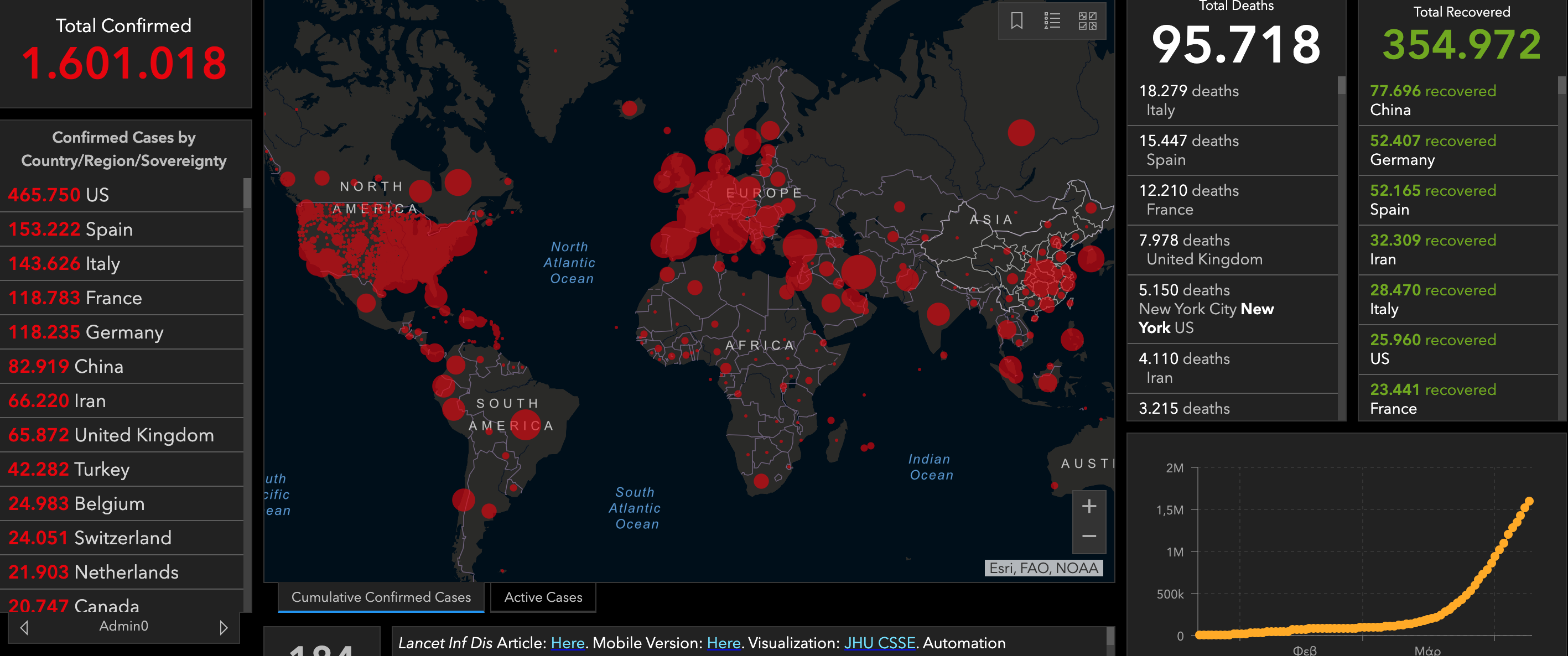 Με πάνω από 18.000 νεκρούς, η Ιταλία παραμένει η χώρα που θρηνεί τα περισσότερα θύματα. Οι ΗΠΑ, που βρίσκονται στη δεύτερη θέση αυτού του μακάβριου καταλόγου, μετρούν 16.748 θύματα, ενώ ακολουθούν η Ισπανία (πάνω από 15.000) και η Γαλλία (πάνω από 12.000). Επίκεντρο της πανδημίας στις ΗΠΑ, η πολιτεία της Νέας Υόρκης θρήνησε άλλους σχεδόν 800 νεκρούς σε 24 ώρες, τον χειρότερό της ημερήσιο απολογισμό ως εδώ. Μολαταύτα ο κυβερνήτης της Άντριου Κουόμο διαβεβαίωσε ότι ο αριθμός των εισαγωγών στα νοσοκομεία δεν ήταν ποτέ μέχρι χθες τόσο χαμηλός αφότου κλιμακώθηκε η πανδημία, ότι «οδεύουμε να εξομαλύνουμε την καμπύλη». Ισπανία, Ιταλία και Γαλλία καταγράφουν επίσης τάση μείωσης των εισαγωγών στα νοσοκομεία.