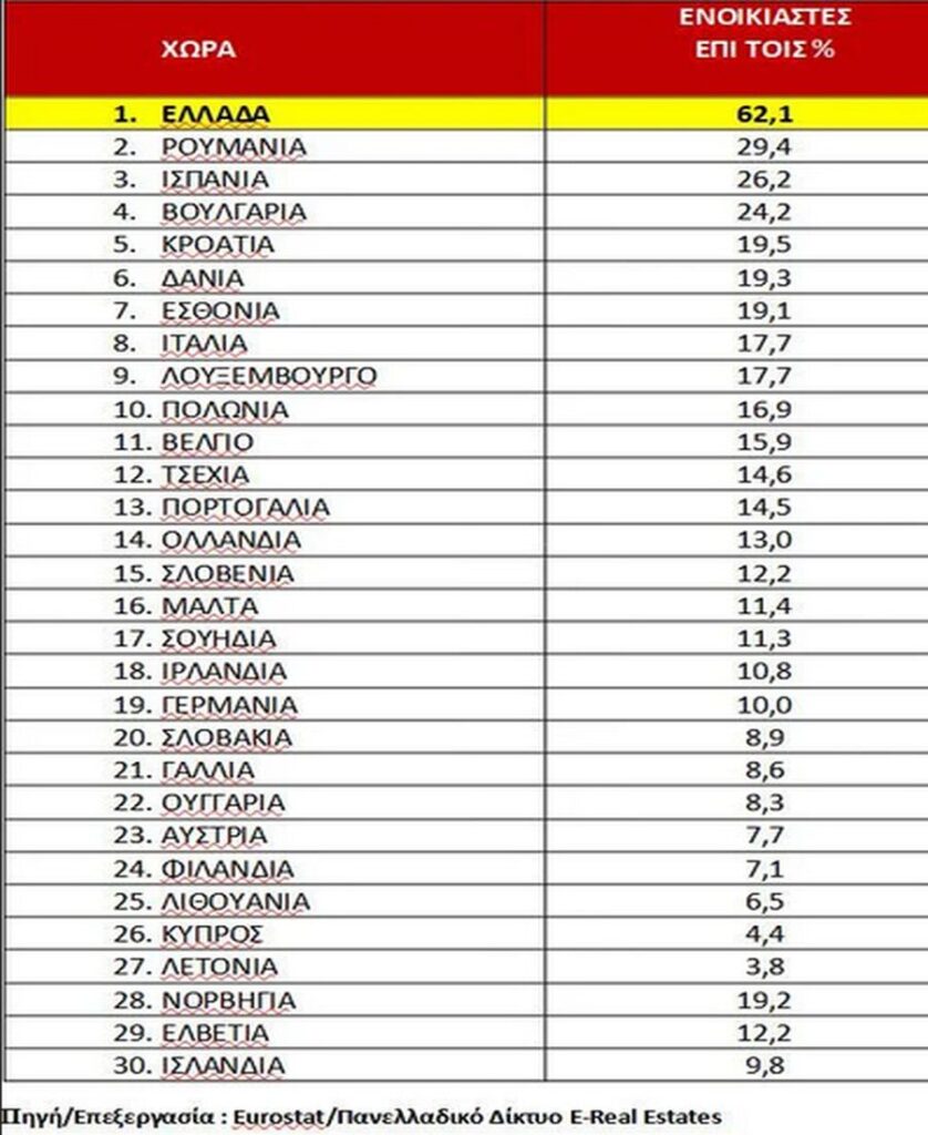 Η δυσκαμψία στην αγορά των ακινήτων στην Ελλάδα, αποδεικνύεται και μέσα από τις έρευνες της Eurostat ήδη από το 2018 -2019. Το κόστος στέγασης για τους ενοικιαστές στη χώρα μας σύμφωνα με τη Eurostat, είναι το πιο υψηλό μεταξύ των κρατών-μελών ΕΕ-27. Η Ελλάδα κατατάσσεται πρωταθλήτρια ανάμεσα σε 27 χώρες της Ευρώπης όπου οι ενοικιαστές δαπανούν άνω του 50% του εισοδήματός τους για στέγη. Συγκεκριμένα, το 62,1% των ενοικιαστών στη χώρα μας δαπανούν πάνω από το 50% του εισοδήματός τους για στέγαση., Δεύτερη κατατάσσεται η Ρουμανία, με ποσοστό 29,4% και ακολουθεί η Ισπανία με 26,2%, δηλαδή περίπου το μισό απ’ ό,τι η Ελλάδα.