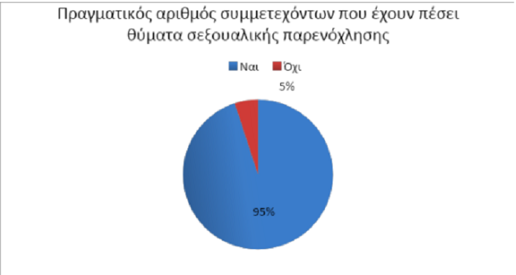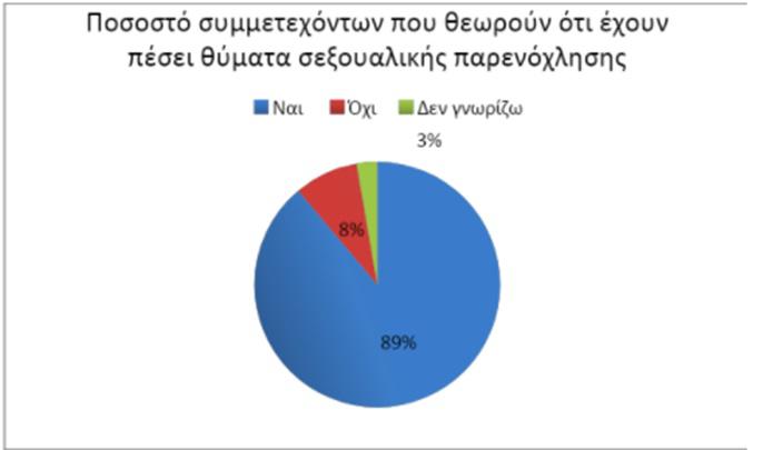 Σύμφωνα με τον παραπάνω ορισμό που δόθηκε για την σεξουαλική παρενόχληση, το 329 άτομα απάντησαν θετικά στην ερώτηση αν θεωρούν ότι έχουν πέσει θύματα σεξουαλικής παρενόχλησης, έστω και μία φορά κατά τη διάρκεια ζωή τους. Αυτοί που απάντησαν αρνητικά ήταν 31, ενώ την απάντηση «δεν γνωρίζω» επέλεξαν 10 άτομα.