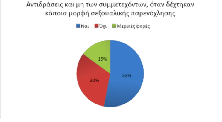 Η έρευνα έδειξε επίσης κατά πόσο οι ερωτηθέντες αντέδρασαν όταν είδαν κάποιο περιστατικό σεξουαλικής παρενόχλησης να συμβαίνει σε ένα τρίτο άτομο. Σύμφωνα με τις απαντήσεις λοιπόν, στις πιο «ήπιες» μορφές παρενόχλησης (σεξουαλικά σχόλια, ανεπιθύμητες ερωτήσεις, σφύριγματα), αντέδρασε το 53%, περίπου το 32% δεν αντέδρασε, ενώ το υπόλοιπο 15% αντέδρασε ανά περίπτωση. Στις πιο βίαιες μορφές σεξουαλικής παρενόχλησης (ανεπιθύμητη επαφή, επίδειξη, κακοποίηση, βιασμός), τα νούμερα είναι μικρότερα. Ειδικότερα, μόνο το 44% αντέδρασε, ενώ το 47% όχι. Το υπόλοιπο 9% αντέδρασε κάποιες φορές, ανάλογα με την περίσταση.