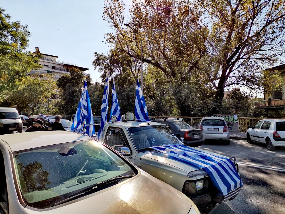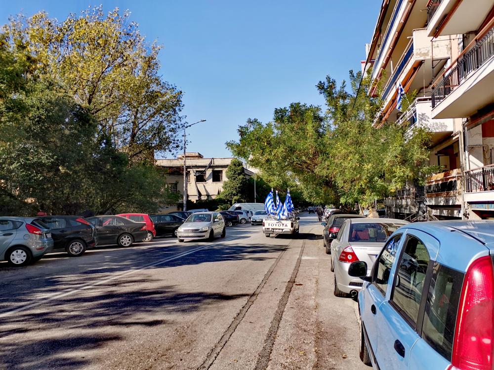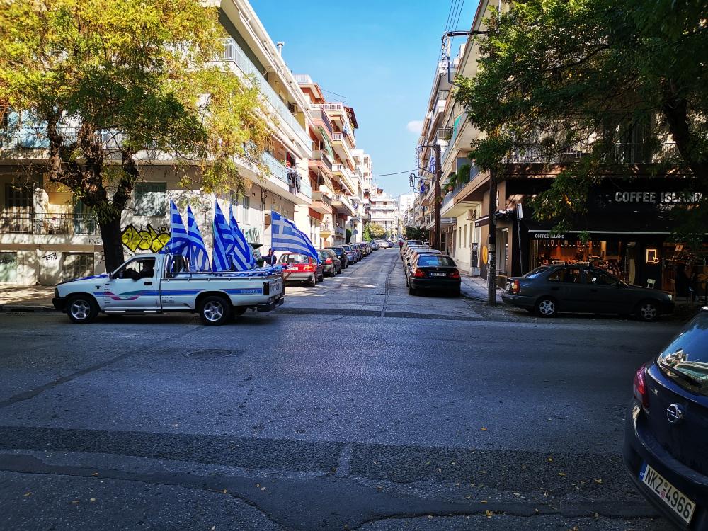 Σημαία-κοντάρι δέκα ευρώ. Ακούγεται στην Τούμπα. Δεν ξέρω κάτι έχουν τα TOYOTA που κουβαλούν ένα φορτίο, μια εικόνα που εύκολα δημιουργεί άλλες εικόνες, σκέψεις, νοηματοδοτείται από τον περαστικό. Στέκομαι και το κοιτάζω να παρελαύνει ως το πιο εθνικά στολισμένο άρμα.