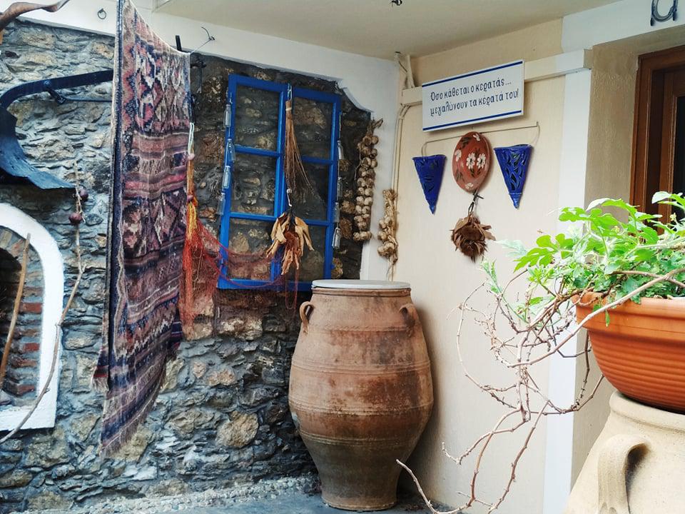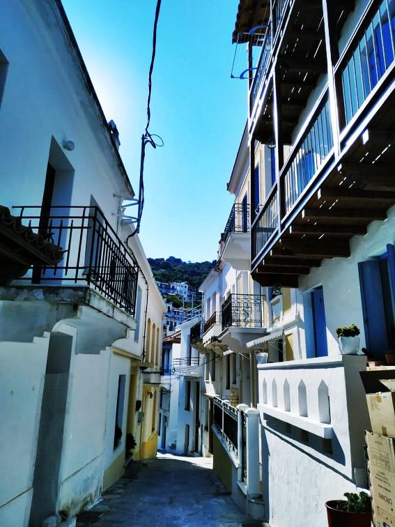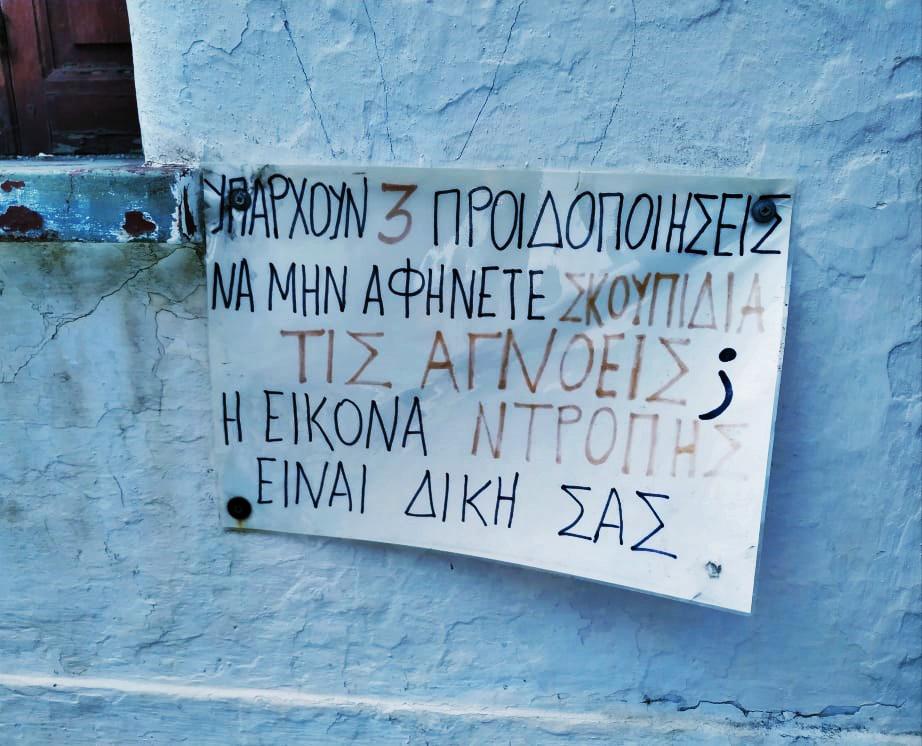 Προχωρούμε. Πριν ακόμα ξεκολλήσουν τσάντες και τα συναφή από την πλάτη, επιβάλλεται μια βόλτα στα σοκάκια. Λάθος τεράστιο, μιας και χρειάζεται αμέτρητα μικρά σκαλάκια να ανεβούμε για να θαυμάσουμε την ομορφιά του μπλε, του λευκού και του πρασίνου που αναβλύζει γύρω μας. Πώς αλήθεια οι ντόπιοι επιστρέφουν σπίτι τους μετά τη δουλειά ή κάποια έξοδο, αναρωτιέται η τεμπέλικη φύση μου. Λίγο παραπέρα μια αξιοπρόσεχτη ταμπέλα- προειδοποίηση για τα απορρίμματα αφήνει αναπάντητο το πρώτο ερώτημα, ωστόσο, οδηγεί στην εξής σημαντική διαπίστωση: Οι Σκοπελίτες και οι Σκοπελίτισσες σέβονται το δημόσιο χώρο και αναμένουν από τους ταξιδιώτες τους αντίστοιχη και απόλυτη συμμόρφωση. Τίμιο. Έχουν ήδη κερδίσει κάπως έτσι το σεβασμό και την εκτίμησή μου.