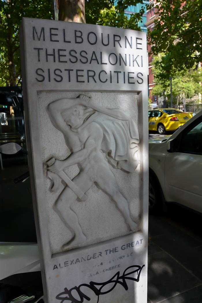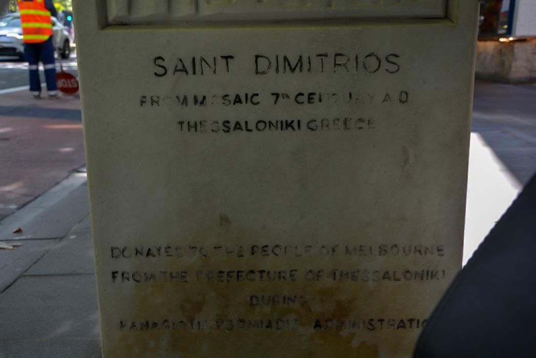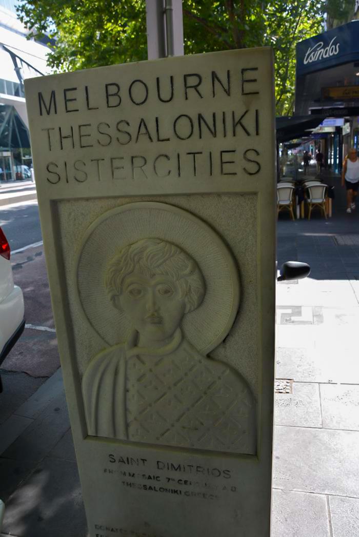 Επιπλέον είδαμε μαρμάρινες στήλες για την αδελφοποίηση Μελβούρνης-Θεσσαλονίκης, με αναφορές στον πολιούχο Άγιο Δημήτριο αλλά και το Μέγα Αλέξανδρο.