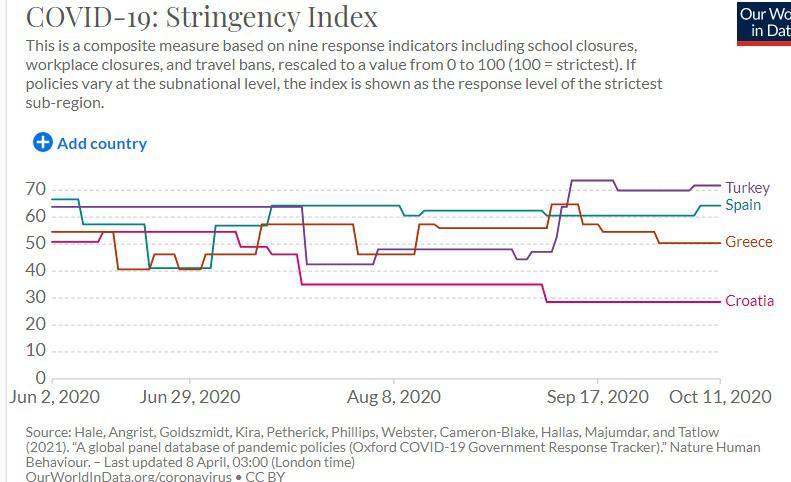 Δεν είναι ίσως τυχαίο ότι το διάστημα 2/6/20 με 11/10/20 η Ελλάδα είχε πιο χαλαρά μέτρα στον έλεγχο των τουριστών από ό,τι είχε η Ισπανία και η Τουρκία. Αυτό δείχνει ο Δείκτης Αυστηρότητας του Πανεπιστημίου του Oxford. Πρώτη στη χαλαρότητα η Κροατία, δεύτερη η Ελλάδα. Η δε Τουρκία να ανεβάζει έξυπνα την αυστηρότητα όταν βλέπει ότι η κατάσταση πάει να ξεφύγει (βλ. γράφημα στο πρώτο σχόλιο).