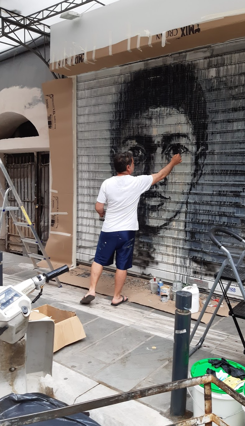 Είναι η αρχή της πραγματοποίησης μιας ιδέας με πρόσωπα της πόλης και άλλα, ζωγραφισμένα σε κεπέγκια καταστημάτων του ιστορικού κέντρου. Το επόμενο Σαββατοκύριακο θα συνεχίσει με το δεύτερο κεπέγκι του καταστήματος.