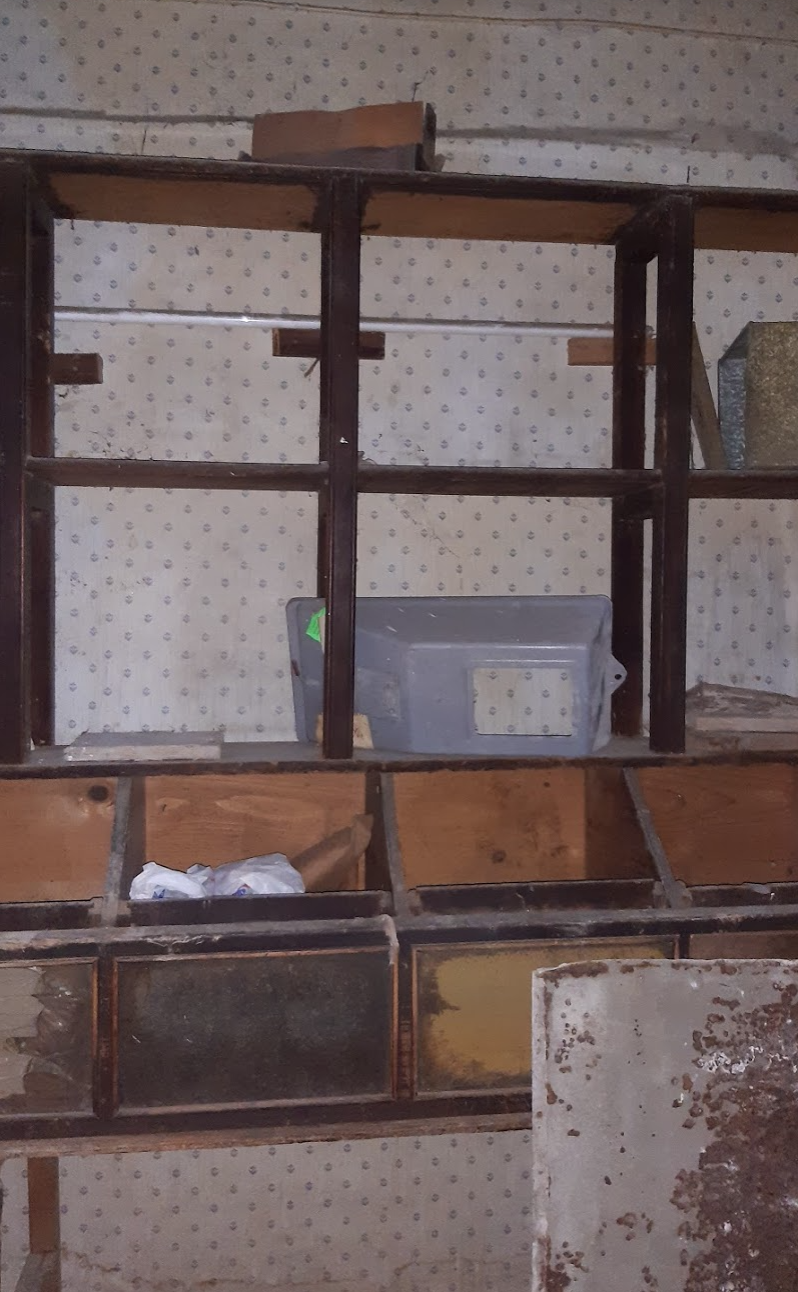 Στο ισόγειο ξέμεινε το ξύλινο έπιπλο από τα παλιά μπακάλικα που μετέφεραν με τη σέσουλα για τον πελάτη όσπρια και διάφορα άλλα είδη.
