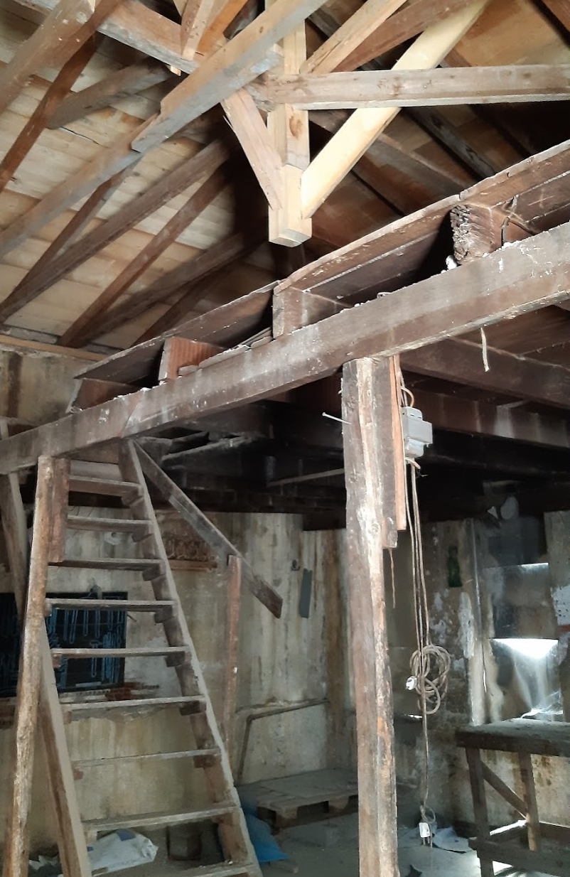 Η στέγη ξύλινη (ανακατασκευασμένη) καθώς και τα βοηθητικά πατάρια.