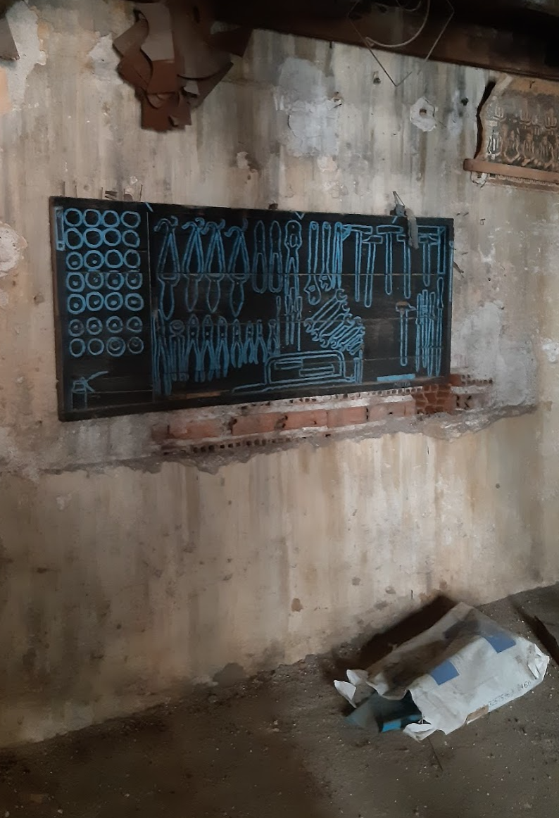 Στους χώρους έχουν παραμείνει στοιχεία του παρελθόντος (πίνακας με σημειωμένα τα εργαλεία του παλιού συνεργείου, πλάι σε μια φωτογραφία γνωστής ομάδας της πόλης την δεκαετία του ’70). Επίσης, σε ένα κλειστό χώρο παρέμεινε ένας τόρνος.