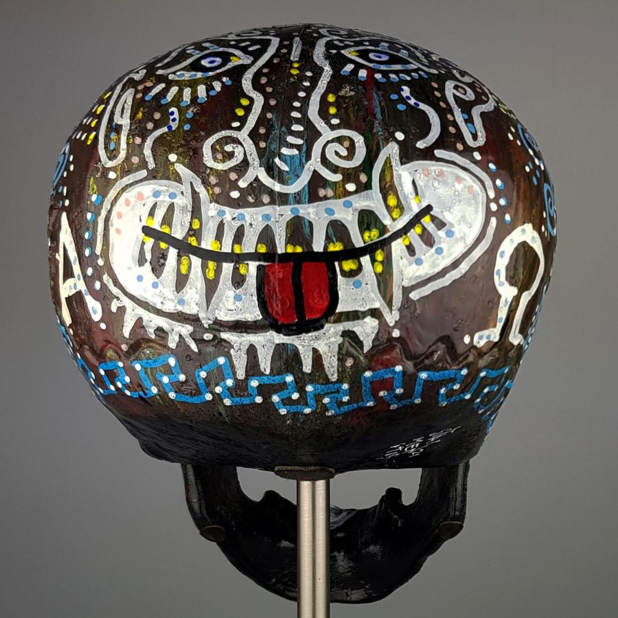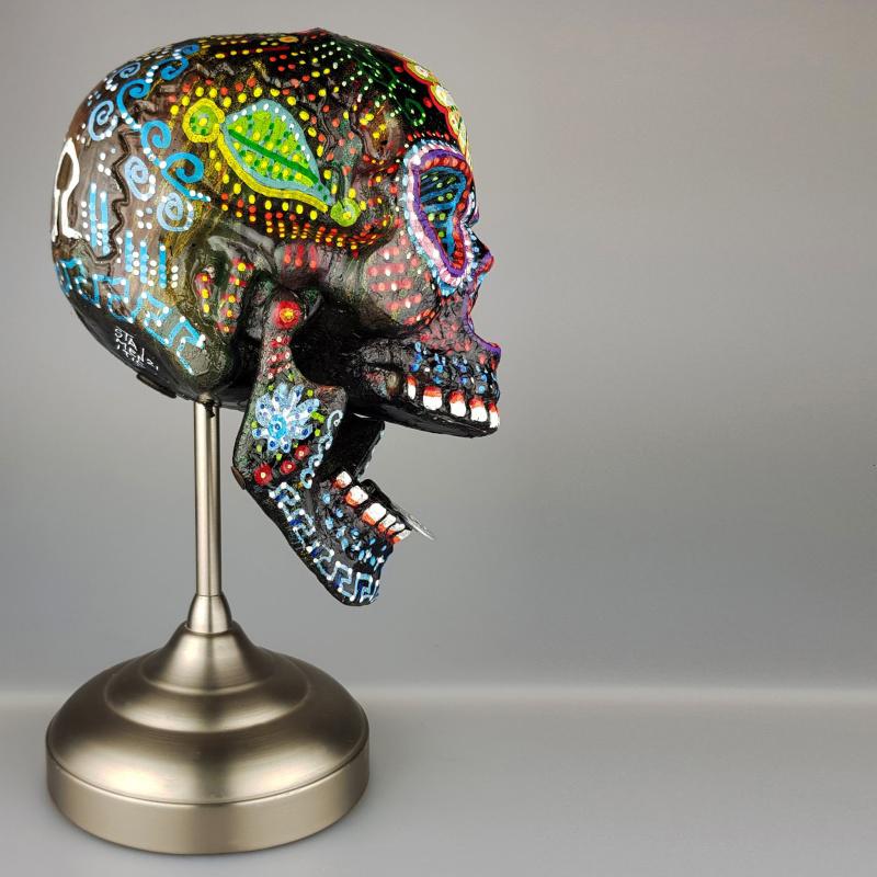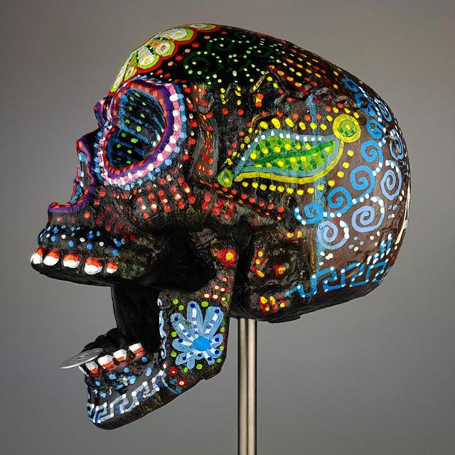 Το εντυπωσιακό έργο του Γιάννη Σταμενίτη ξεχωρίζει, το μαύρο ομοίωμα ανθρώπινου κρανίου με πολύχρωμα μοτίβα ζωγραφισμένα πάνω του μας θυμίζει την «Ημέρα των νεκρών» στο Μεξικό.