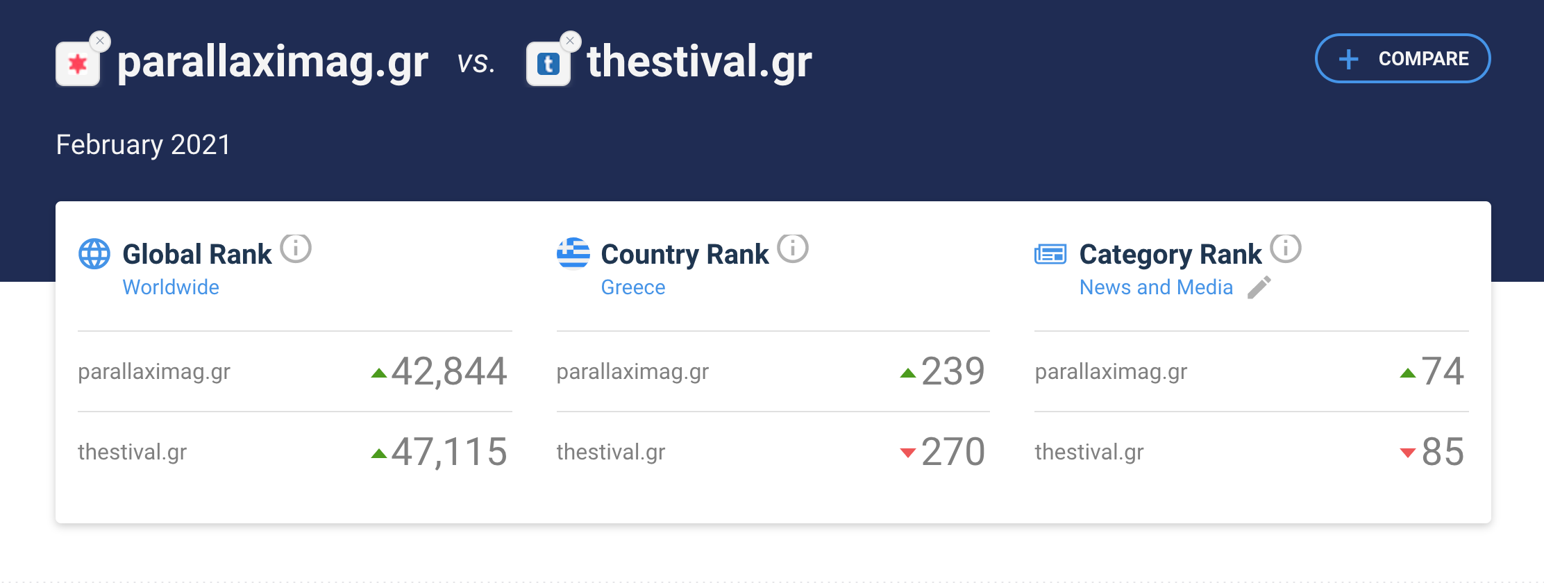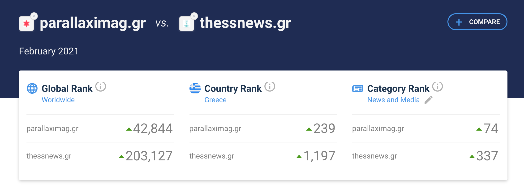 Το αναγνωστικό κοινό αντάμοιψε την προσπάθεια μας. Τα στοιχεία του Similar Web, του πιο αξιόπιστου συγκριτικού μετρητή sites αποτυπώνει τις επιδόσεις μας σε σχέση με τα υπόλοιπα δημοσιογραφικά site της πόλης.