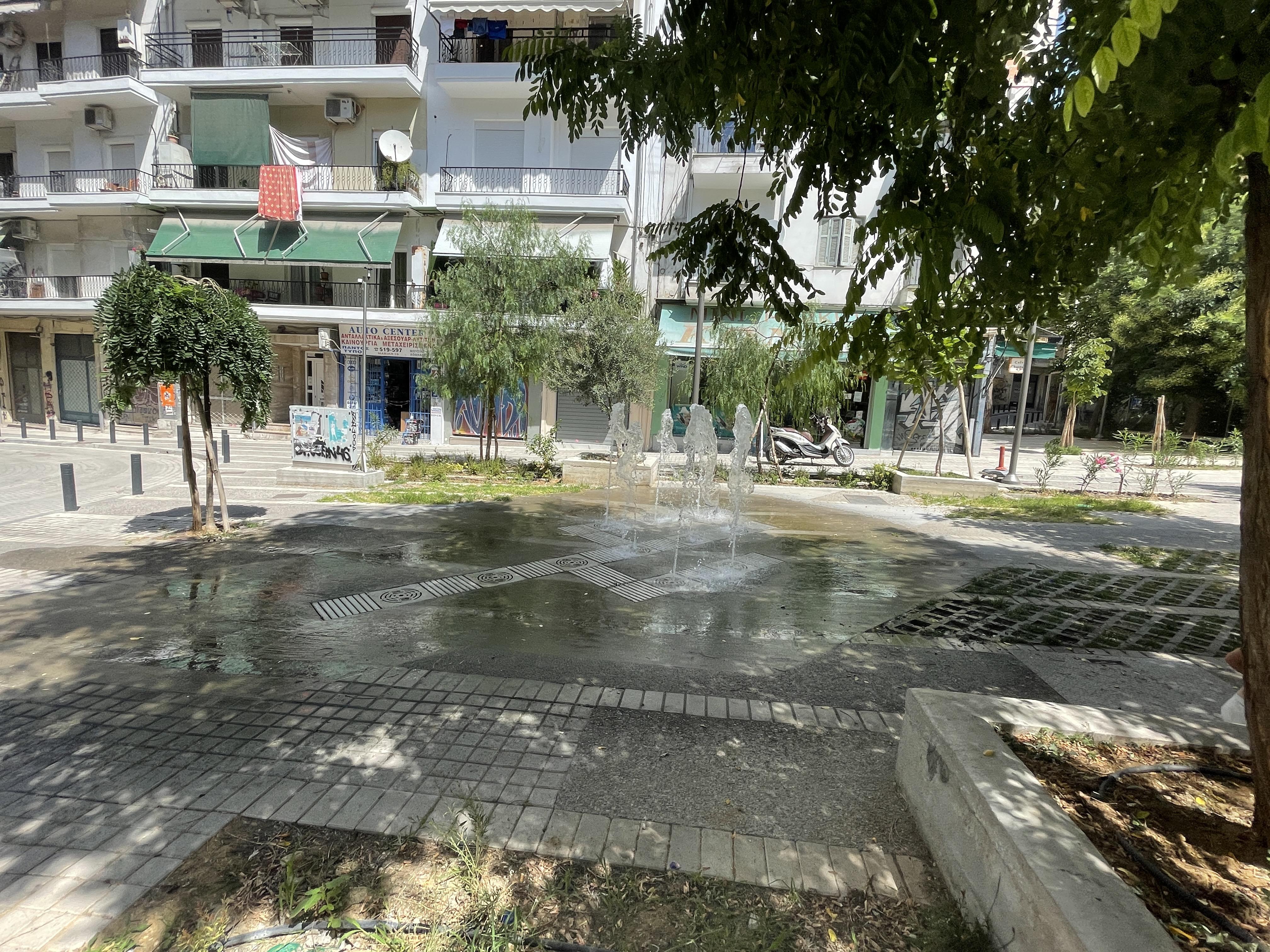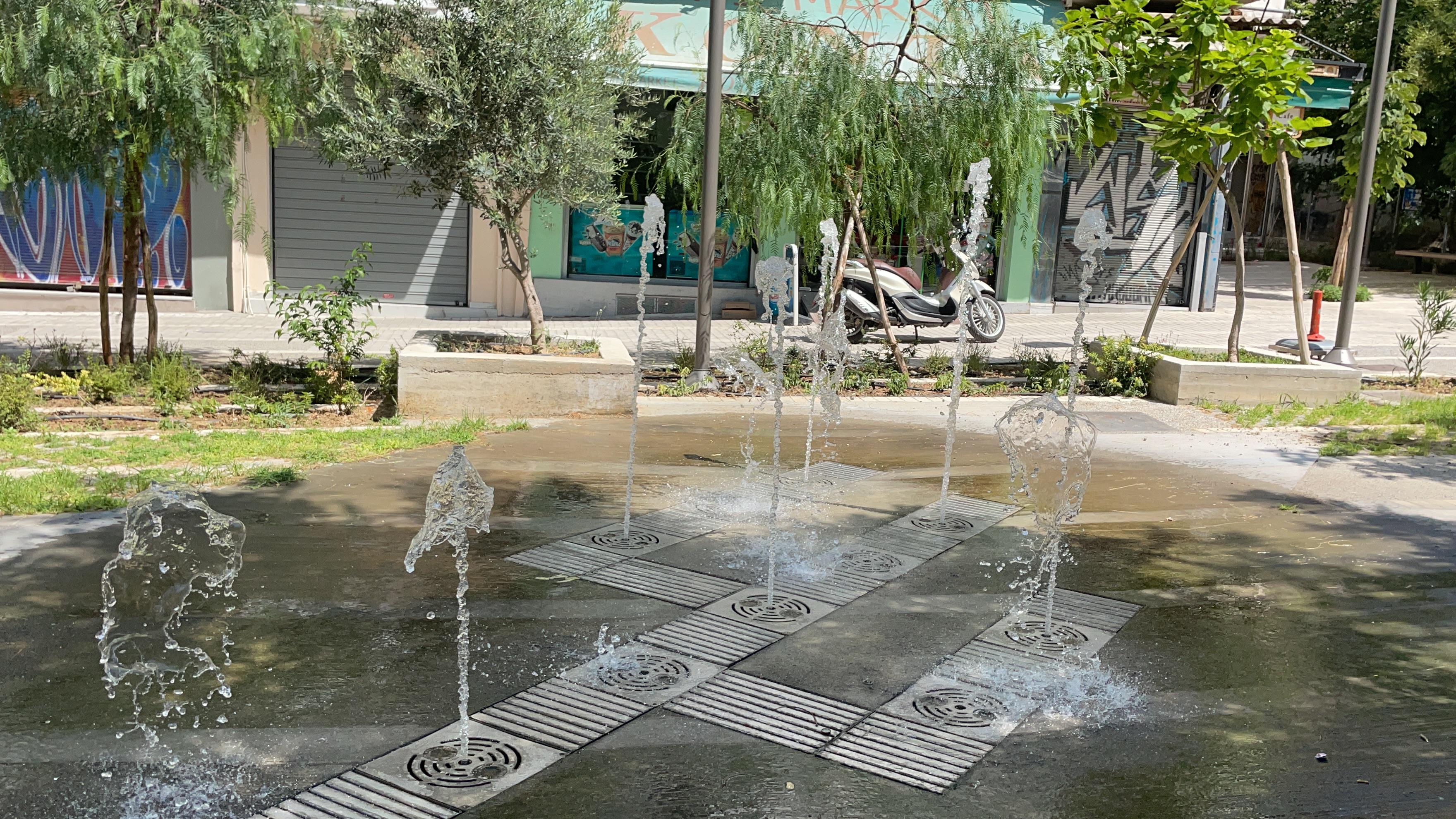 Σιντριβάνι με τρεις σειρές από πίδακες νερού, νέες δενδροστοιχίες, φυτεύσεις, χτιστά καθίσματα αλλά και νέο φωτισμό και διαπλατυσμένα πεζοδρόμια στη νέα εποχή.