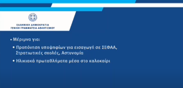 Επιπλέον, ειδική μέριμνα θα υπάρξει για τους υποψηφίους μαθητές των Πανελλαδικών που έχουν δηλώσει Σ.Ε.Φ.Α.Α., Στρατιωτικές σχολές και Σχολές Σωμάτων Ασφαλείας, ώστε στο αμέσως επόμενο στάδιο άρσης των περιορισμών και σε συνεργασία με το Υπουργείο Παιδείας, να μπορούν να προπονηθούν επαρκώς για τα αγωνίσματα στα οποία θα εξεταστούν.