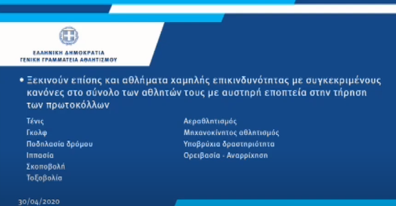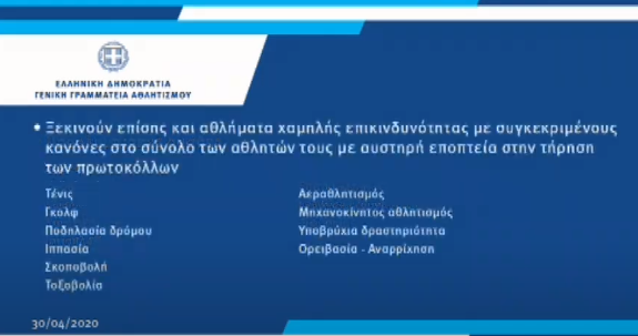 «Αρχικά, θα επιτραπούν όλες οι ατομικές προπονήσεις στους αθλητές και στις αθλήτριες που έχουν ήδη προκριθεί ή δεκδικούν την πρόκριση για τους Ολυμπιακούς Αγώνες, σύμφωνα με την εισήγηση της Ελληνικής Ολυμπιακής Επιτροπής.