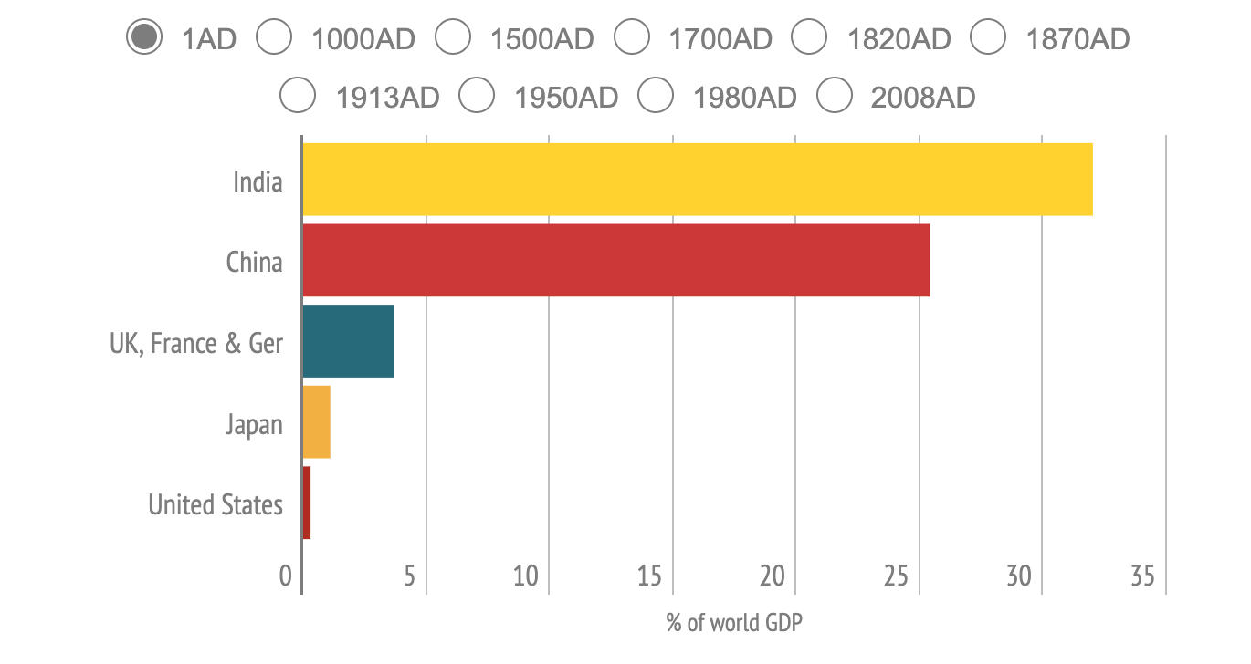 Η εποχή μας χαρακτηρίζεται από μια γεωπολιτική μοναδικότητα, ή για να είμαστε πιο ακριβείς, αποτελεί το τέλος αυτής της μοναδικότητας. Για πάνω από 1.500 χρόνια η Ανατολή, και με αυτόν τον όρο θα αναφερόμαστε στην Ινδία και την Κίνα, αποτελούσε αθροιστικά περίπου το 50% του παγκόσμιου πλούτου. Συγκεκριμένα, αναλύοντας τα ποσοστά του παγκόσμιου Α.Ε.Π, από το έτος 1 μ. Χ έως και το έτος 1820 το ποσοστιαίο άθροισμα επί του παγκόσμιου Α.Ε.Π της Κίνας και της Ινδίας κυμαίνεται από 46,8 έως 57,4%. Αυτή η κατάσταση αποτελεί μια παγκόσμια σταθερά. Αίτιά της είναι ο μεγάλος πληθυσμός αυτών των κρατών, η έντονη εμπορική τους δραστηριότητα σε τομείς που είχαν ζήτηση στις δυτικές κοινωνίες (όπως οι πολύτιμοι λίθοι, τα μπαχαρικά, η πορσελάνη, το μετάξι και το τσάι) καθώς και το γεγονός ότι η Κίνα μπορούσε να εξυπηρετεί μόνη της όλες τις παραγωγικές της ανάγκες.