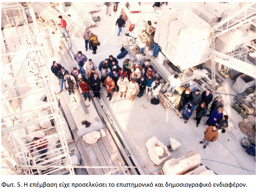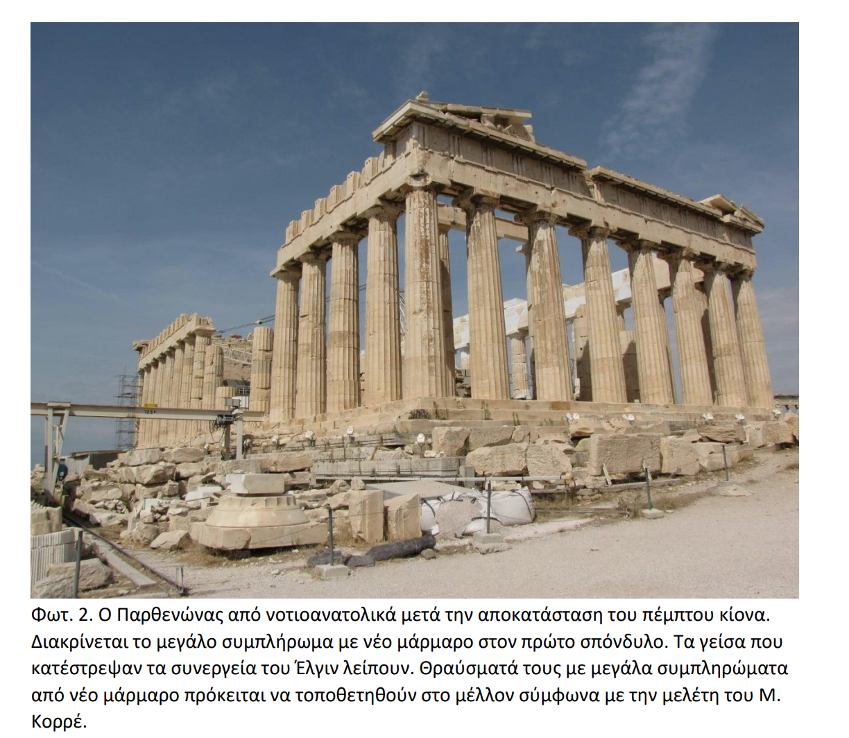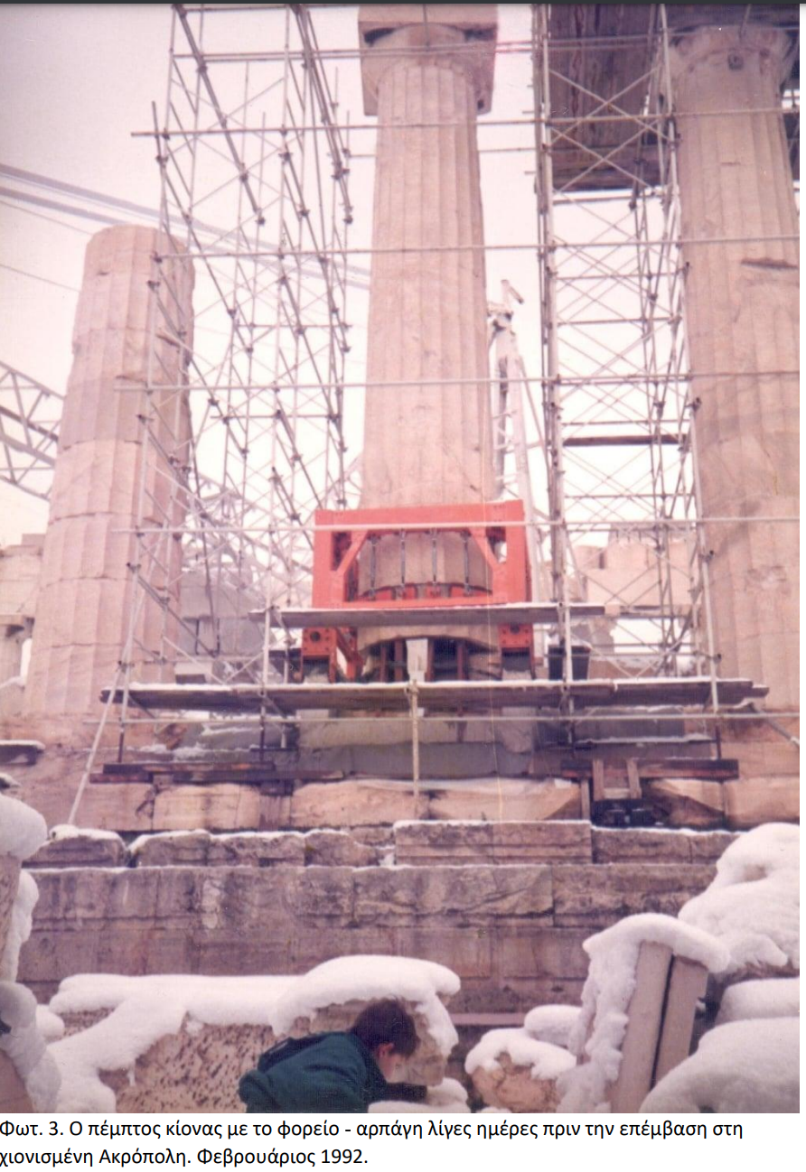 Η πολυετής διαμάχη για την μεταχείριση των αρχαιοτήτων που αποκαλύφθηκαν κατά την κατασκευή του μετρό της Θεσσαλονίκης στο σταθμό της οδού Βενιζέλου και είναι πανθομολογουμένως ένα μοναδικό τοπόσημο ανεκτίμητης αξίας για την ιστορία της πόλης, μου θύμισε μια πρωτότυπη επέμβαση για την αποκατάσταση του πέμπτου από ανατολικά κίονα της νότιας πλευράς του Παρθενώνα πριν από 28 χρόνια. Στα έργα συντήρησης των μνημείων της Ακρόπολης έχουν αποσυναρμολογηθεί χιλιάδες αρχιτεκτονικά μέλη που μεταφέρθηκαν στα εργαστήρια, αποκαταστάθηκαν και επέστρεψαν στα μνημεία. Όμως αυτές οι επεμβάσεις αφορούσαν στη μεγάλη τους πλειονότητα σε αναστηλωμένα τμήματα των μνημείων, τα οποία είχαν ανακατασκευαστεί από πεσμένα στο έδαφος αρχιτεκτονικά μέλη· αυτά μάλιστα δεν είχαν τοποθετηθεί κατά κανόνα στις αρχικές θέσεις τους και χρειάστηκε να γίνουν διορθώσεις.