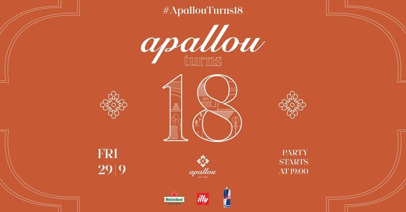 To Apallou κλείνει 18 υπέροχα χρόνια μαζί με την αγάπη του κόσμου! Μια αγάπη που δυναμώνει, μεταδίδεται και συνεχίζεται. Σε καλεί να γιορτάσετε παρέα την ενηλικίωσή του. Χαμόγελα, μουσικάρες, αγκαλιές, μπαλόνια, δώρα, ταξίδια κι όλα όσα θέλει να κάνει κάποιος στα 18, σε περιμένουν την Παρασκευή 29/9 από τις 19:00 και μετά, στην καρδιά της Θεσσαλονίκης.