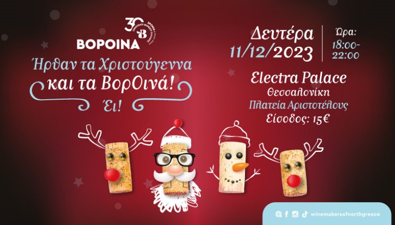 *Τα ΒορΟινά των Χριστουγέννων, Δευτέρα 11 Δεκεμβρίου 2023, Ώρες 18:00-22:00, Ξενοδοχείο Electra Palace, Πλατεία Αριστοτέλους, Θεσσαλονίκη, Κόστος εισιτηρίου: 15€ *** Κρατήσεις εισιτηρίων μέσω Viva «ΒορΟινά Χριστουγέννων 2023 Θεσσαλονίκη» και στη γραμματεία της εκδήλωσης ***