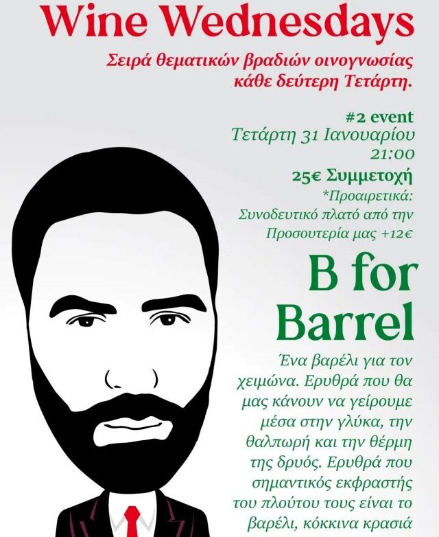 Ένα βαρέλι για τον χειμώνα. Ερυθρά που θα σας κάνουν να γείρετε μέσα στη γλύκα, την θαλπωρή και την θέρμη της δρυός. Ερυθρά που σημαντικός εκφραστής του πλούτου τους είναι το βαρέλι, κόκκινα κρασιά που αγαπάνε το βαρέλι! Αυτή την Τετάρτη (31.01.2024), όπως και κάθε δεύτερη Τετάρτη, ο οινοκριτικός και σύμβουλος οίνου Παύλος Γκέγκας σας περιμένει για μία γευσιγνωσία υψηλής αισθητικής, ποιότητας και αξίας κρασιών.