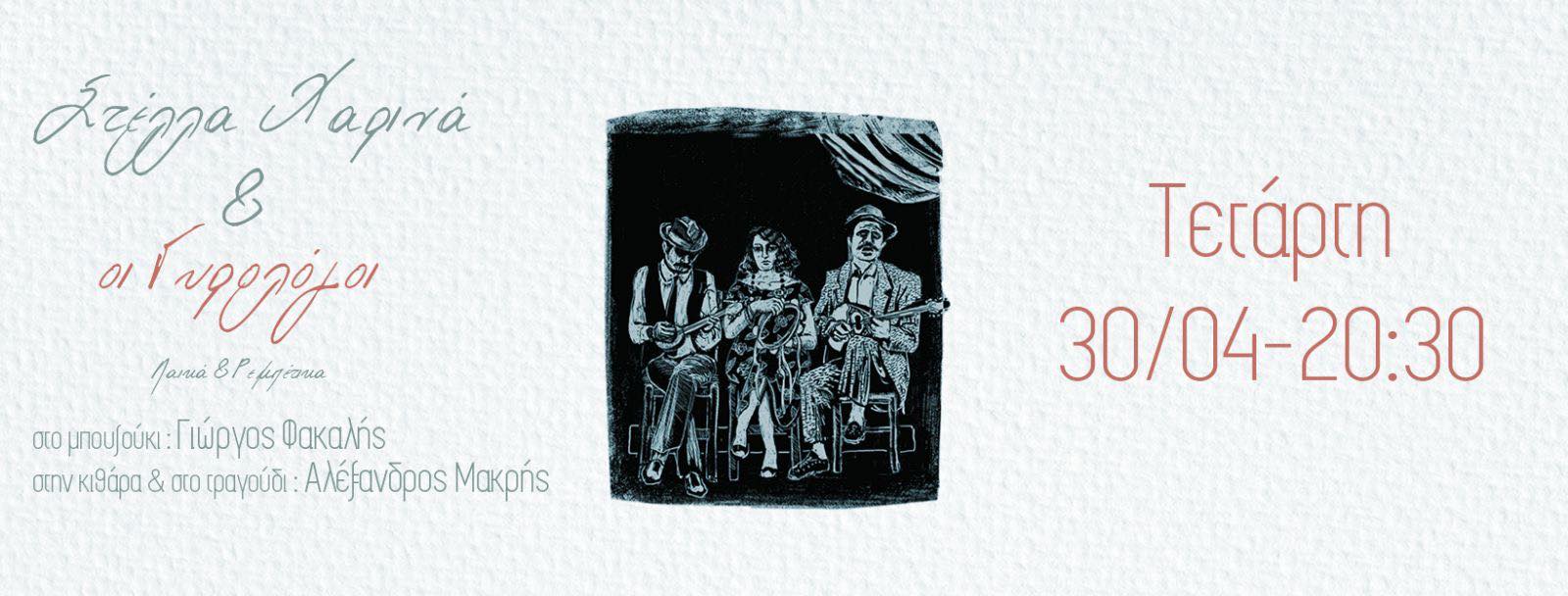 Αυτή την Τετάρτη υποδέχεται τη Στέλλα Χαρινά, που με την αυθεντική λαϊκή φωνή της θα μοιραστεί σας ρεμπέτικα και παλιά λαϊκά τραγούδια. Τη συνοδεύουν στο μπουζούκι ο Γιώργος Φακαλής και στην κιθάρα-τραγούδι ο Αλέξανδρος Μακρής. Ένα live για όσους ξέρουν να περνούν καλά!